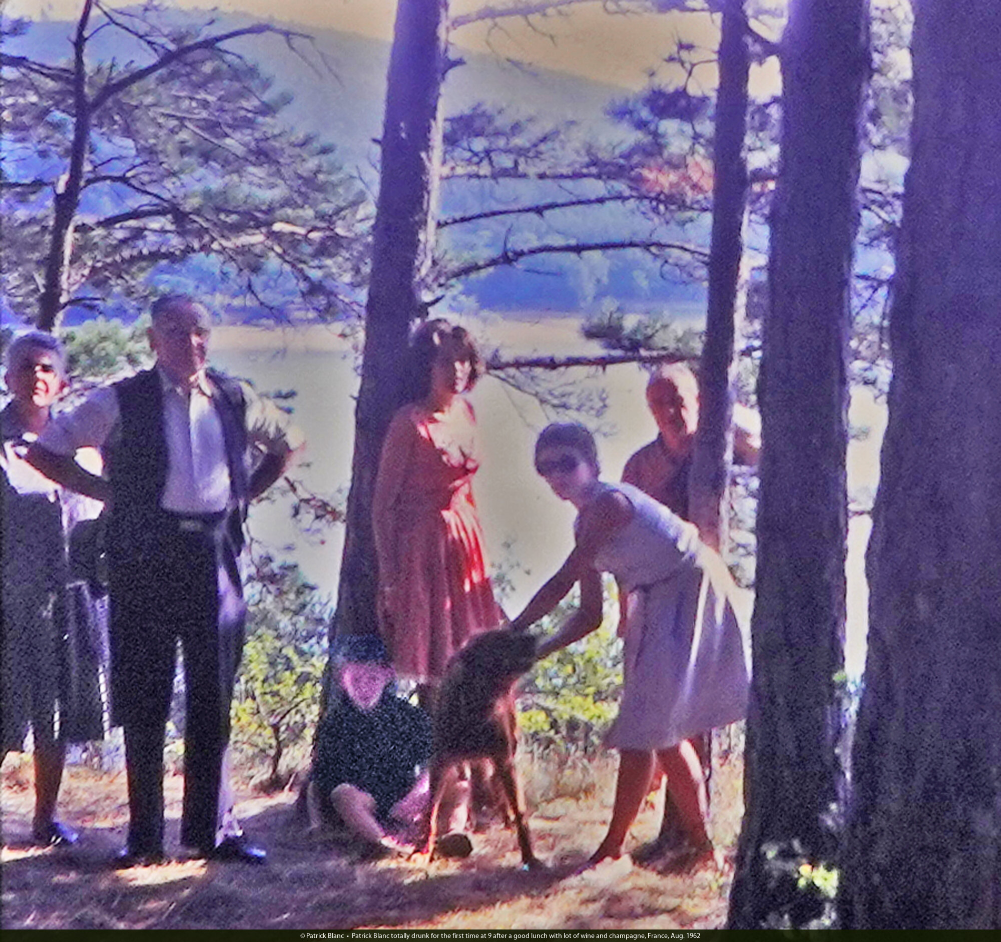 Patrick Blanc totally drunk for the first time at 9 after a good lunch with lot of wine and champagne, France, Aug. 1962