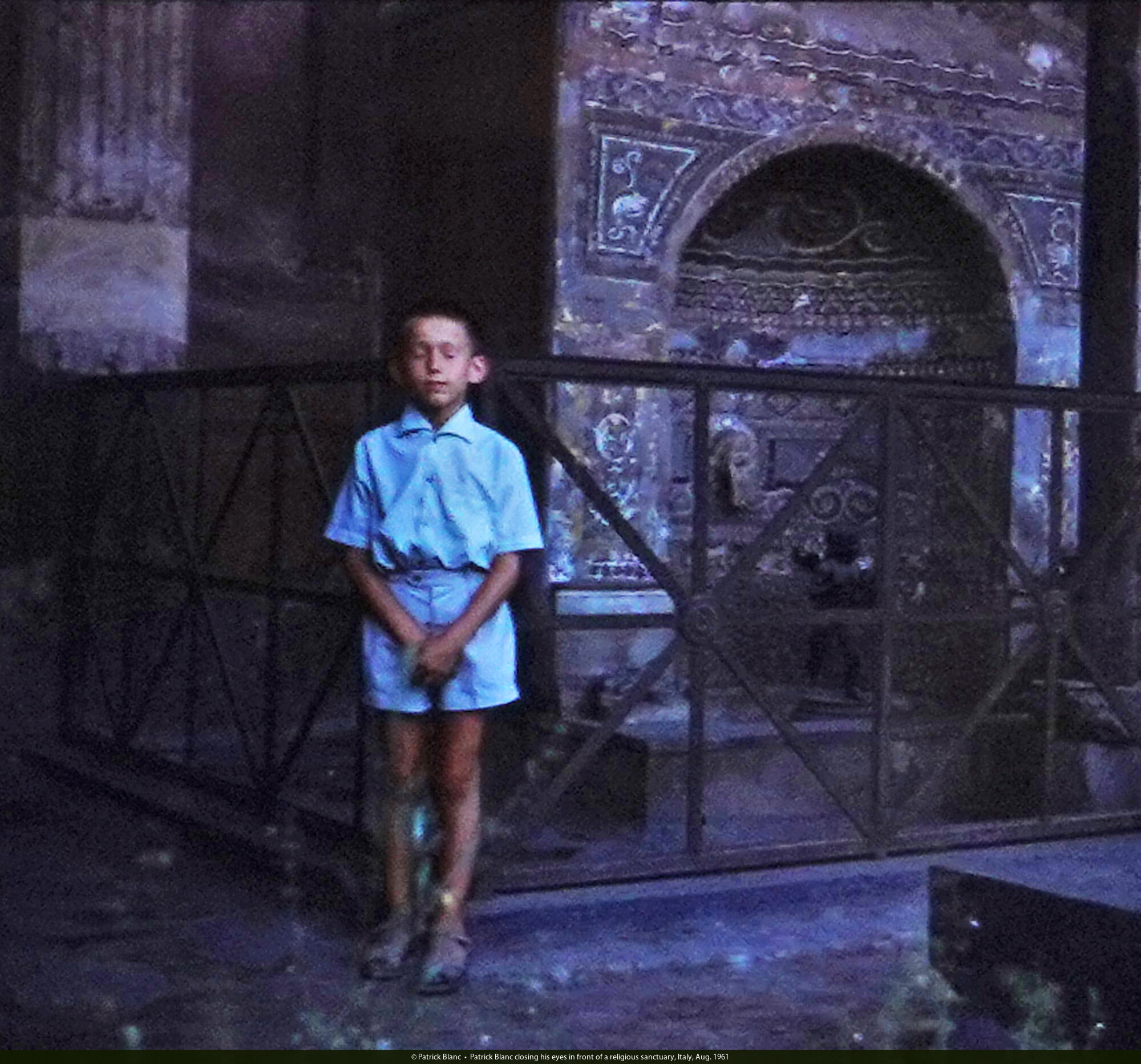 Patrick Blanc closing his eyes in front of a religious sanctuary, Italy, Aug. 1961