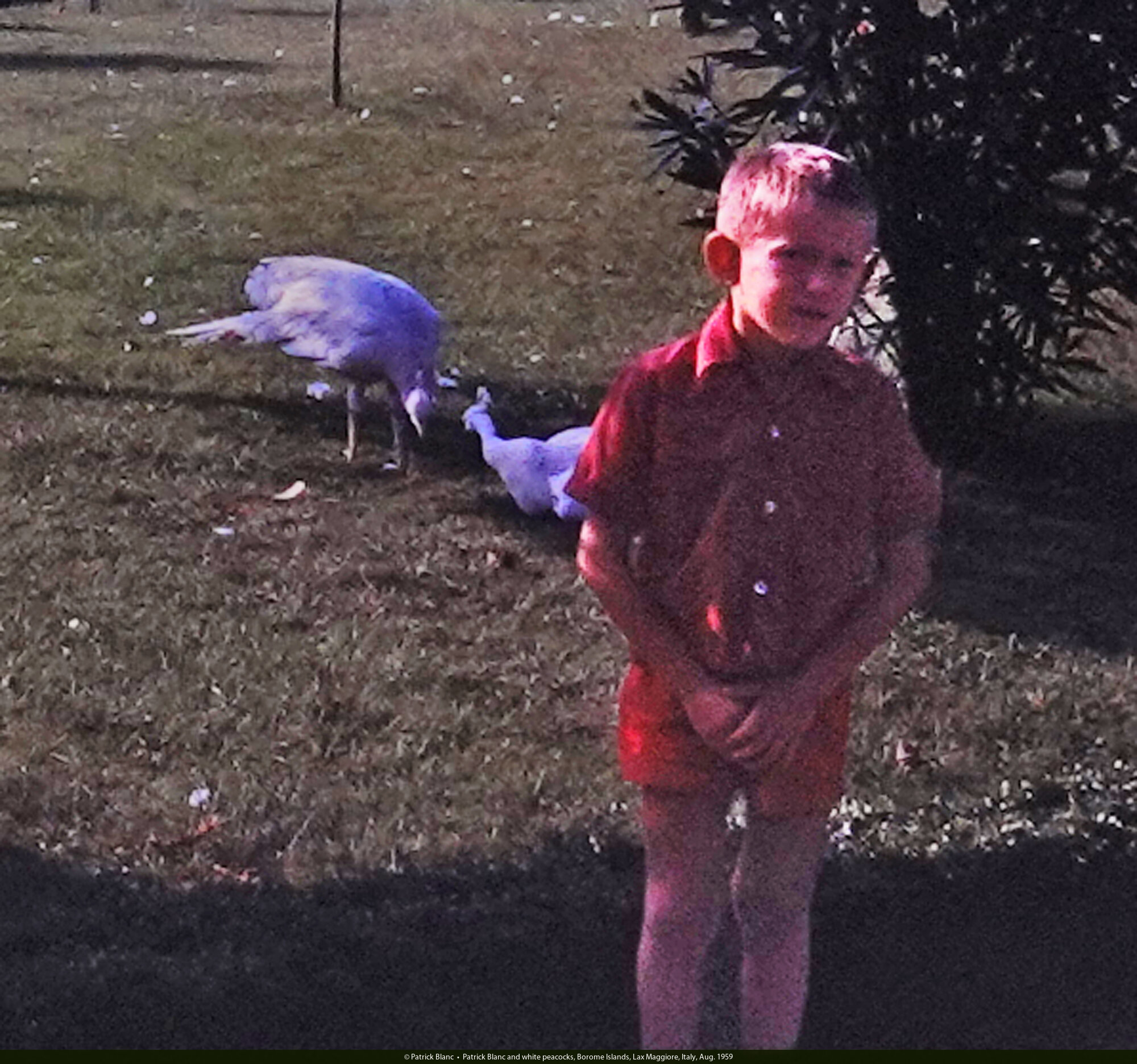 Patrick Blanc and white peacocks, Borome Islands, Lax Maggiore, Italy, Aug. 1959