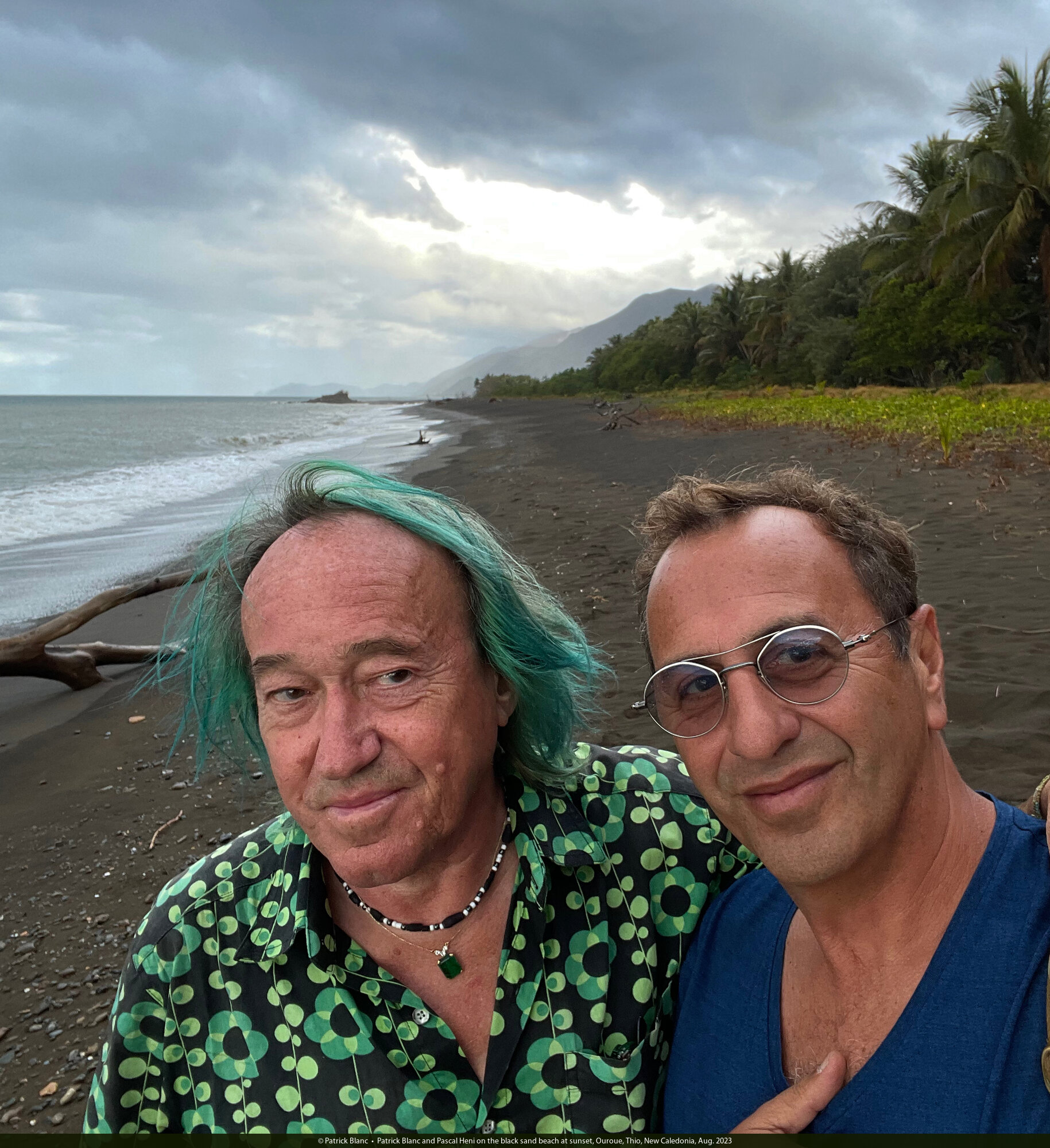 Patrick Blanc and Pascal Heni on the black sand beach at sunset, Ouroue, Thio, New Caledonia, Aug. 2023