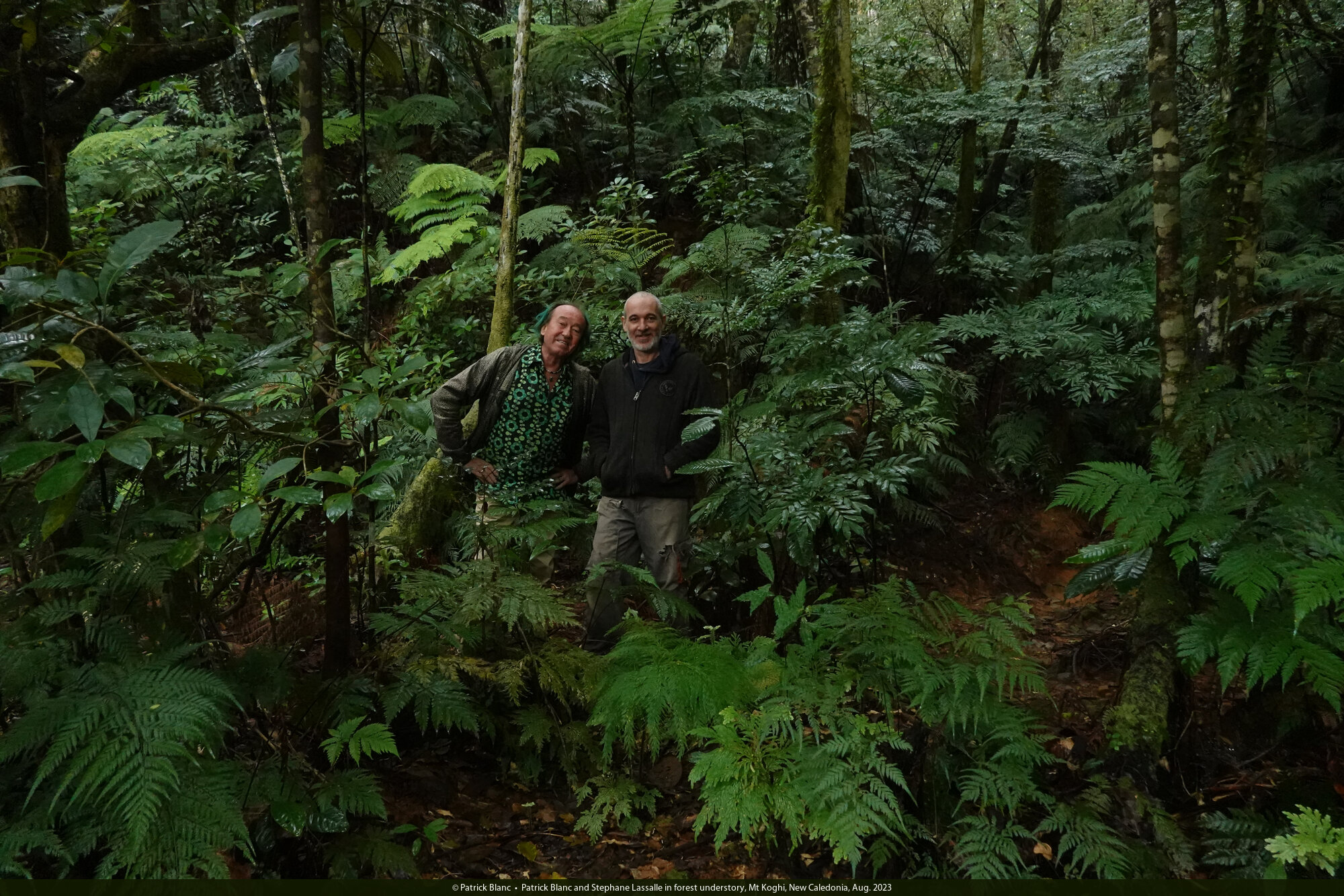 Patrick Blanc and Stephane Lassalle in forest understory, Mt Koghi, New Caledonia, Aug. 2023