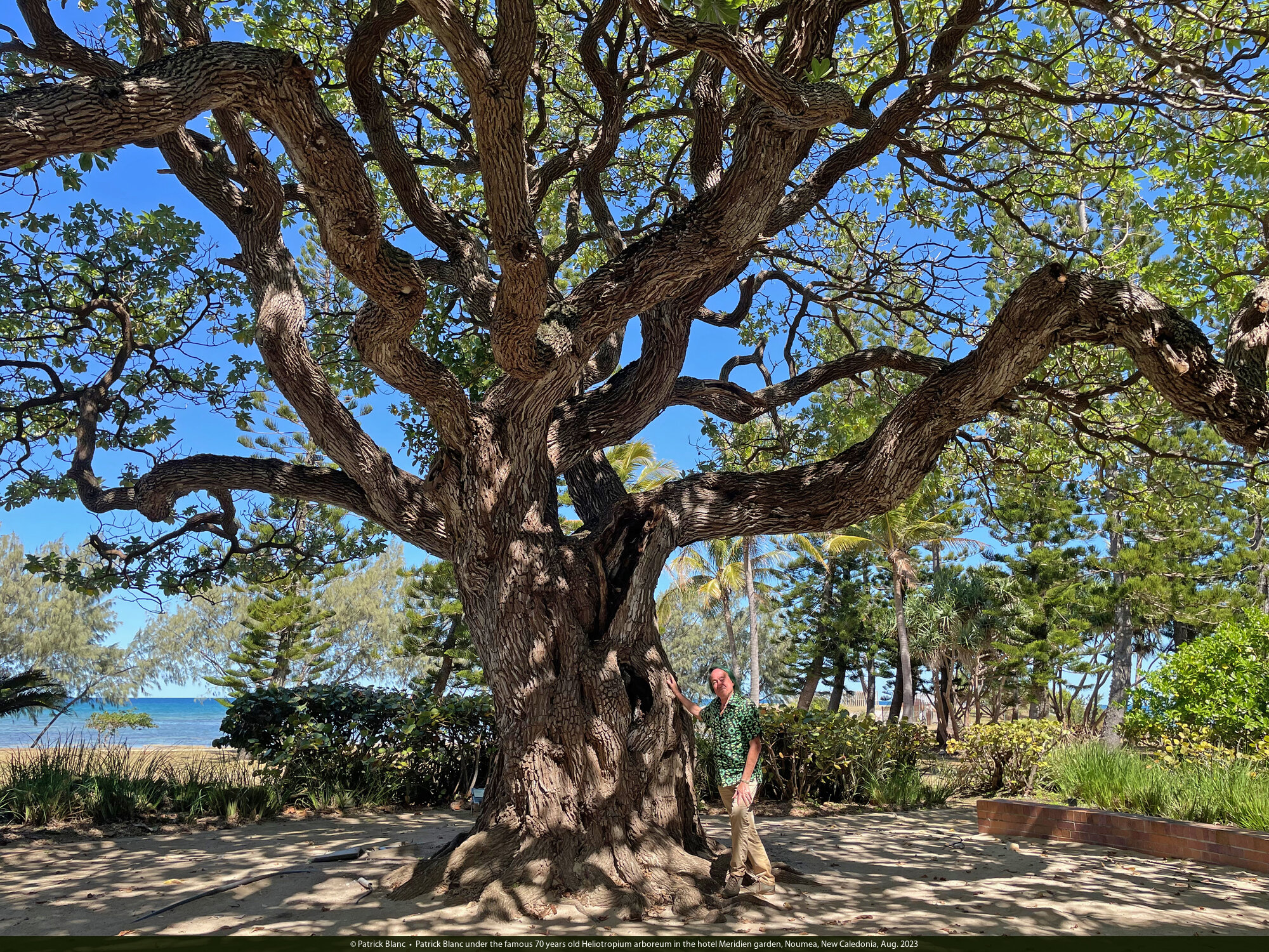 Patrick Blanc under the famous 70 years old Heliotropium arboreum in the hotel Meridien garden, Noumea, New Caledonia, Aug. 2023