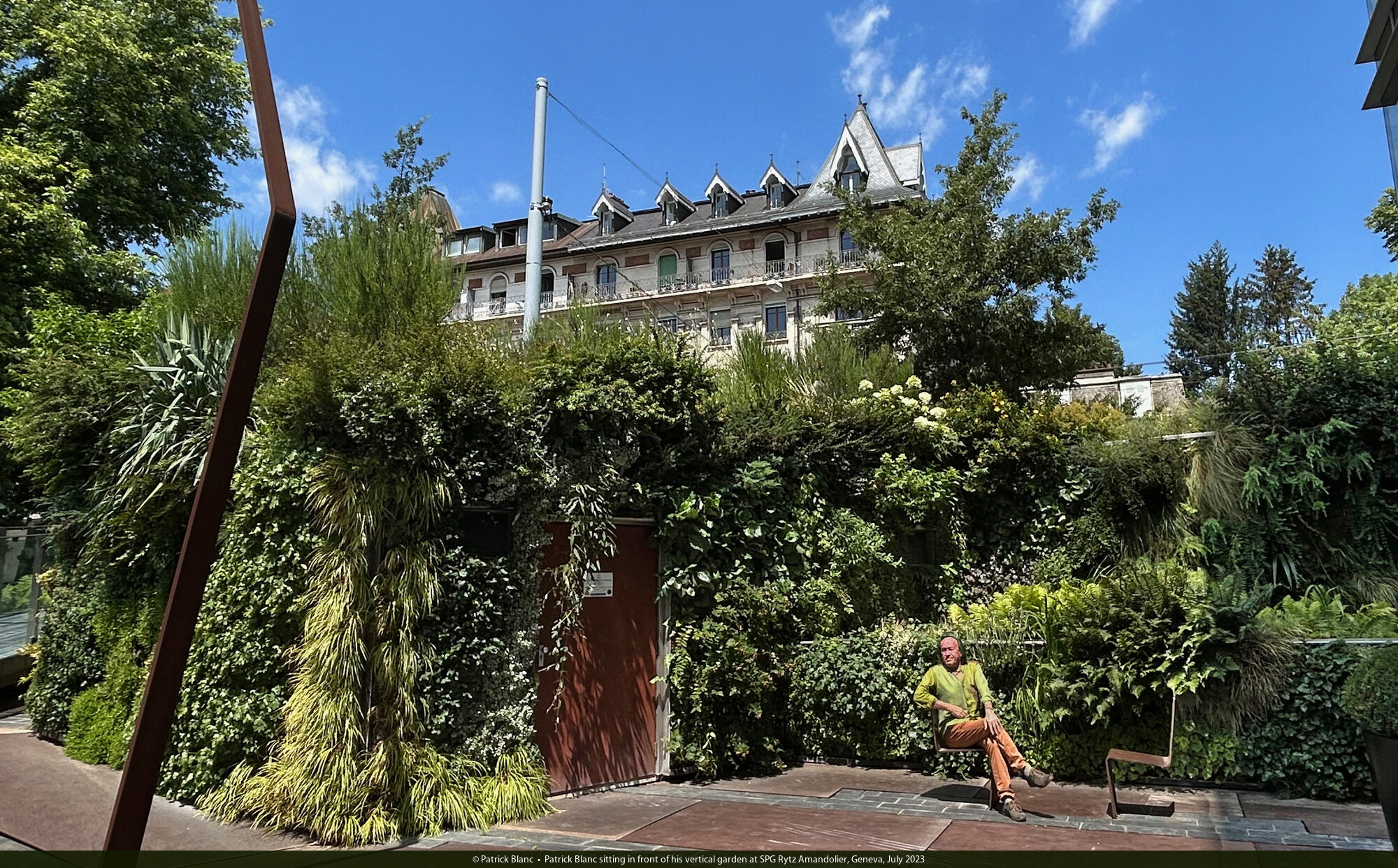 Patrick Blanc sitting in front of his vertical garden at SPG Rytz Amandolier, Geneva, July 2023