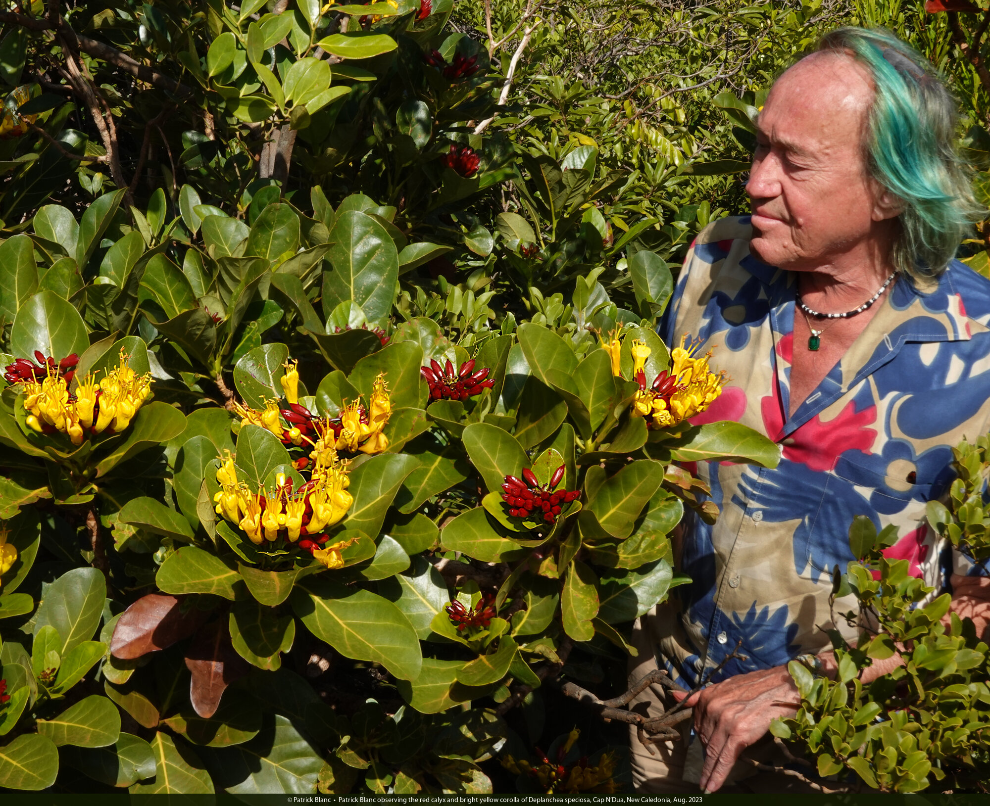 Patrick Blanc observing the red calyx and bright yellow corolla of Deplanchea speciosa, Cap N'Dua, New Caledonia, Aug. 2023