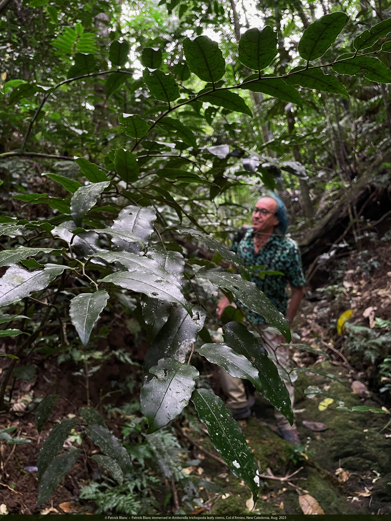 Patrick Blanc immersed in Amborella trichopoda leafy stems, Col d'Amieu, New Caledonia, Aug. 2023