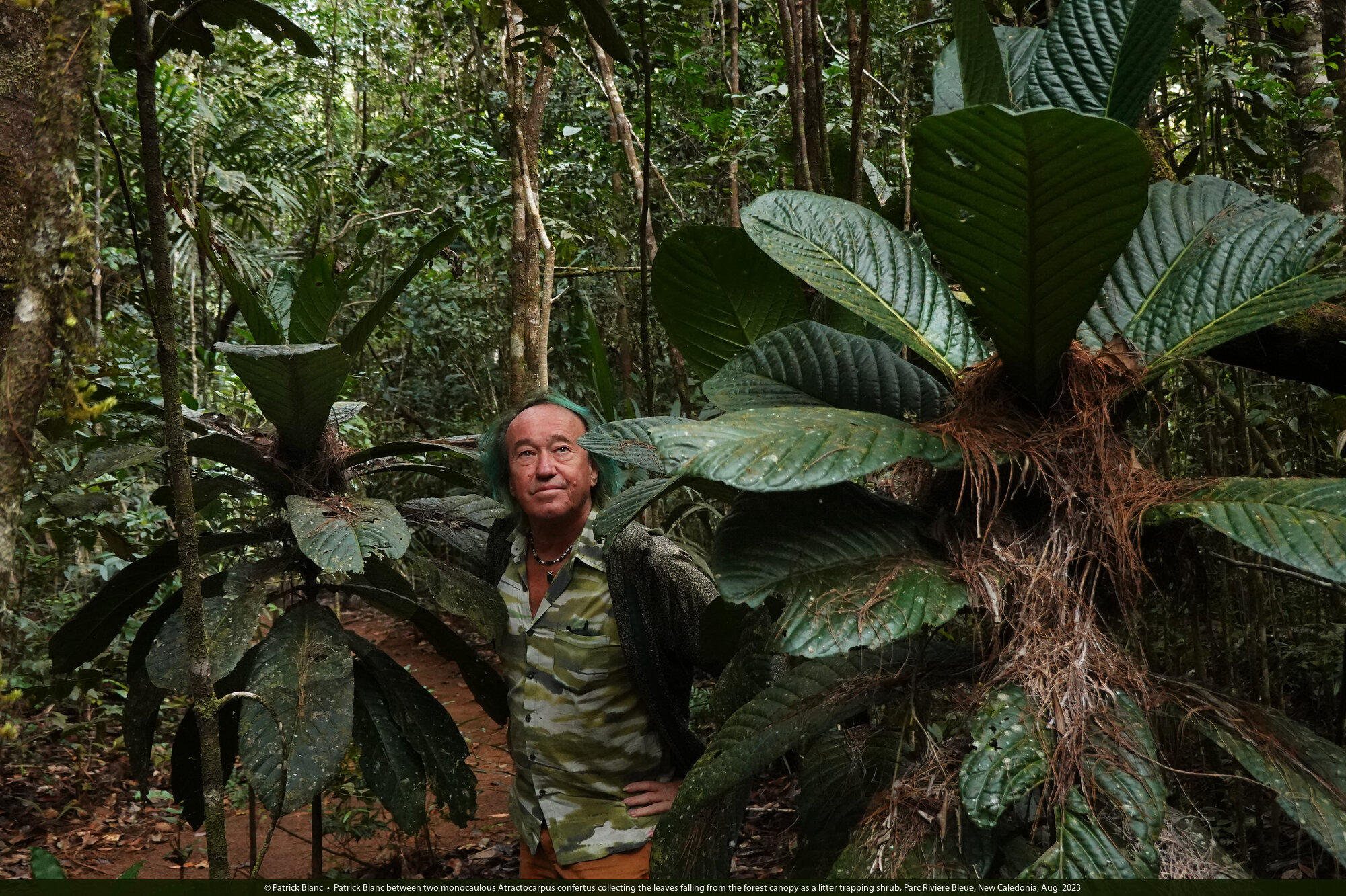 Patrick Blanc between two monocaulous Atractocarpus confertus collecting the leaves falling from the forest canopy as a litter trapping shrub, Parc Riviere Bleue, New Caledonia, Aug. 2023
