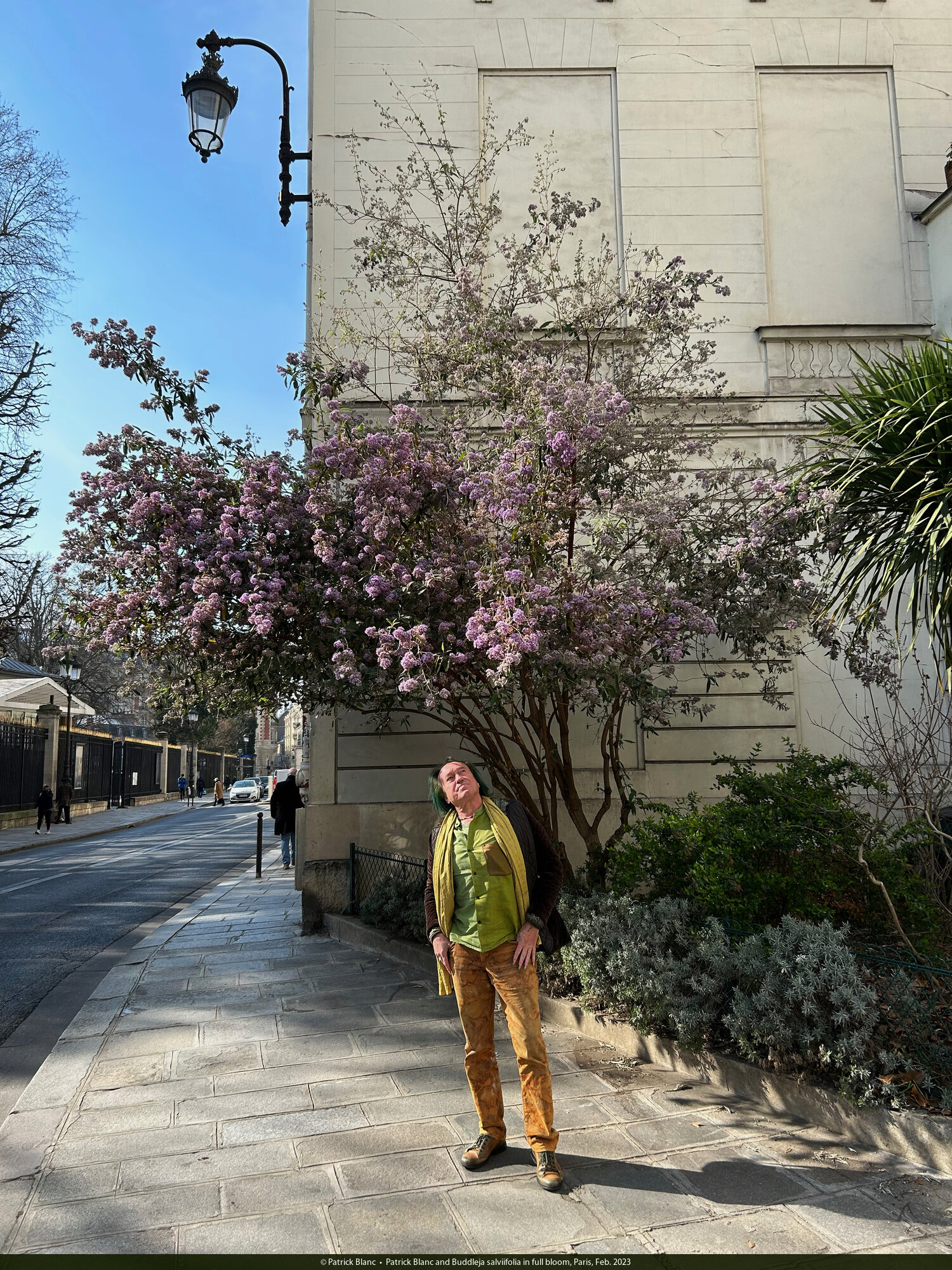 Patrick Blanc and Buddleja salviifolia in full bloom, Paris, Feb. 2023