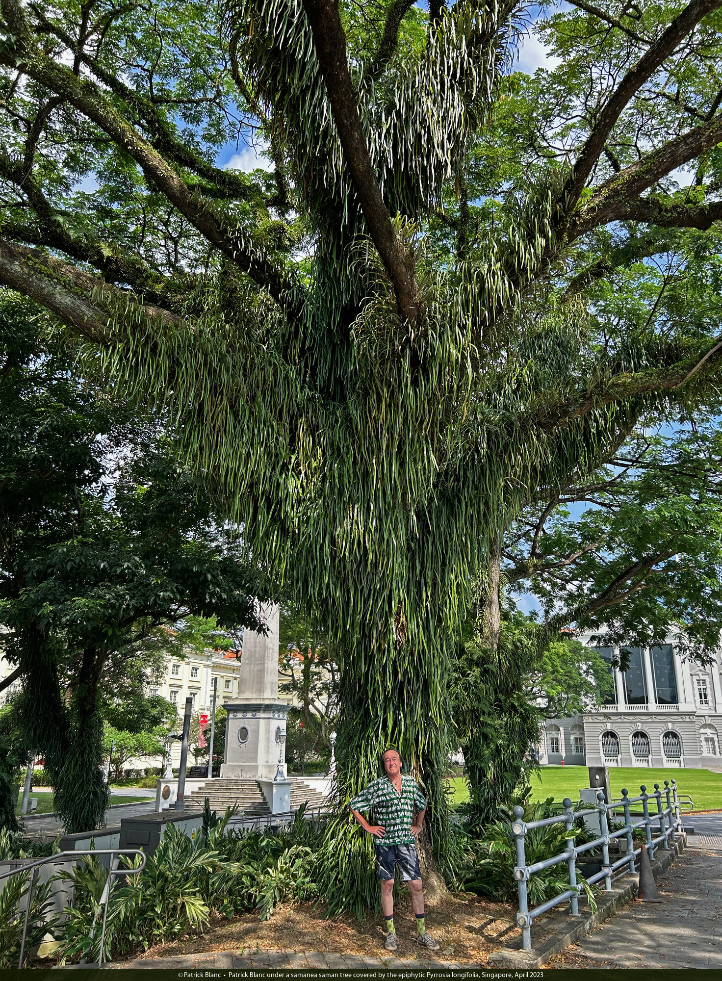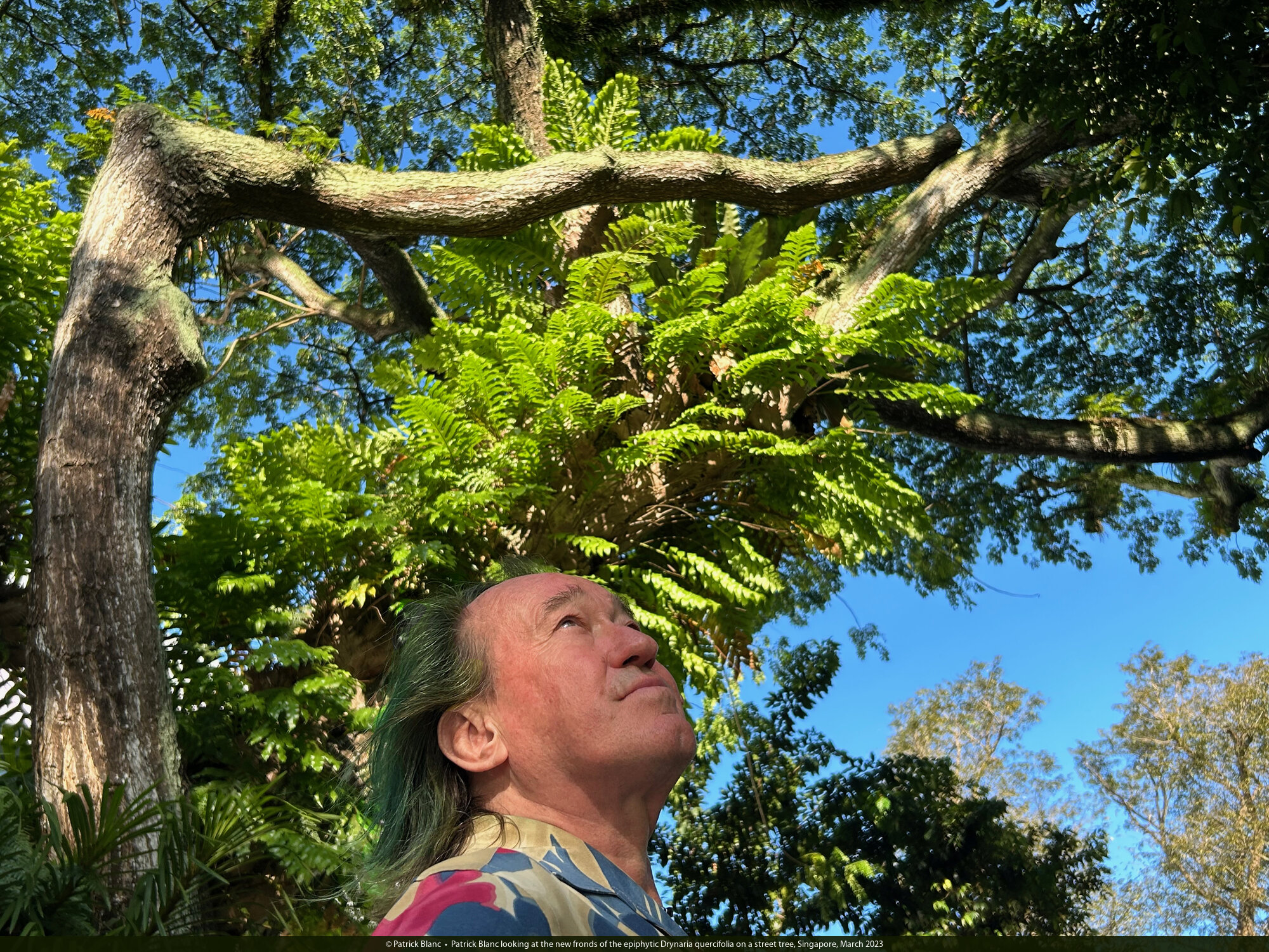 Patrick Blanc under a samanea saman tree covered by the epiphytic Pyrrosia longifolia, Singapore, April 2023