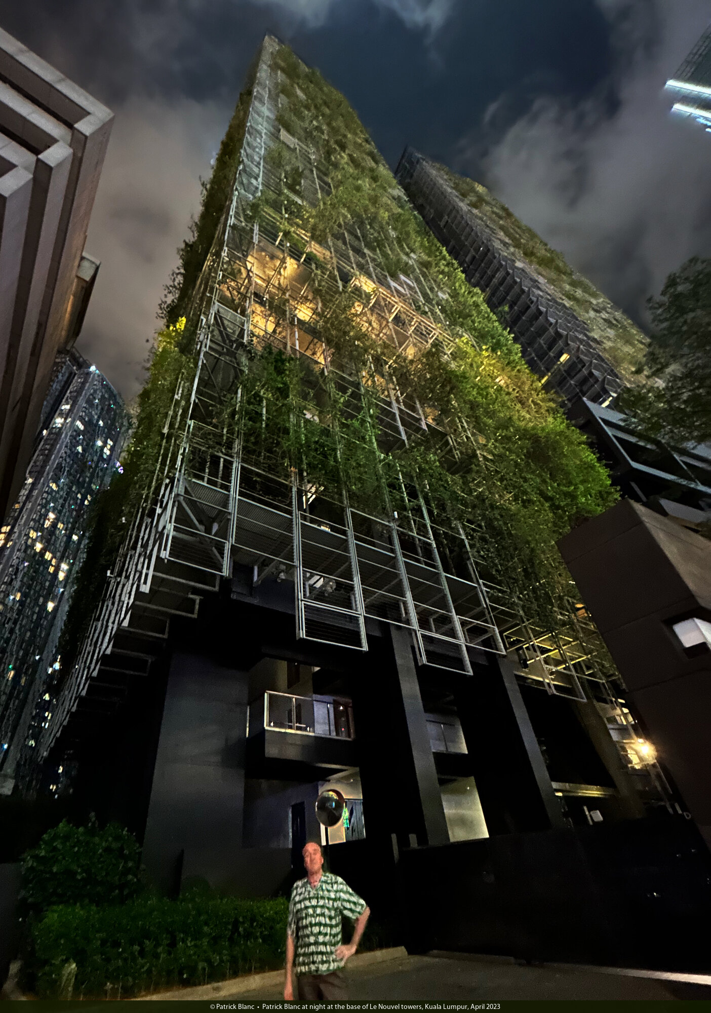 Patrick Blanc at night at the base of Le Nouvel towers, Kuala Lumpur, April 2023