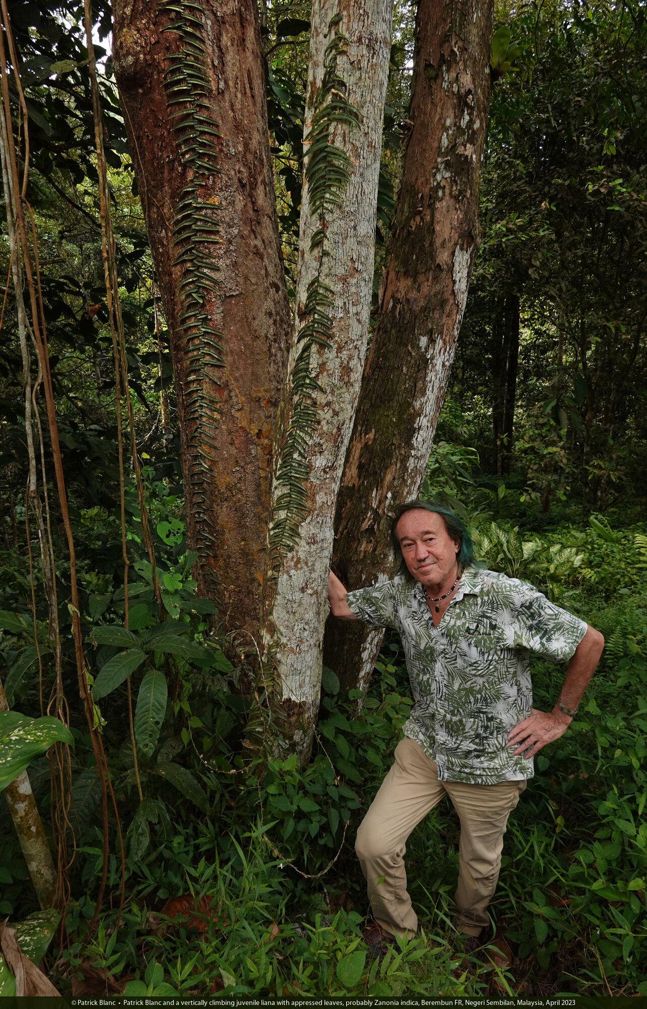 Patrick Blanc and a vertically climbing juvenile liana with appressed leaves, probably Zanonia indica, Berembun FR, Negeri Sembilan, Malaysia, April 2023