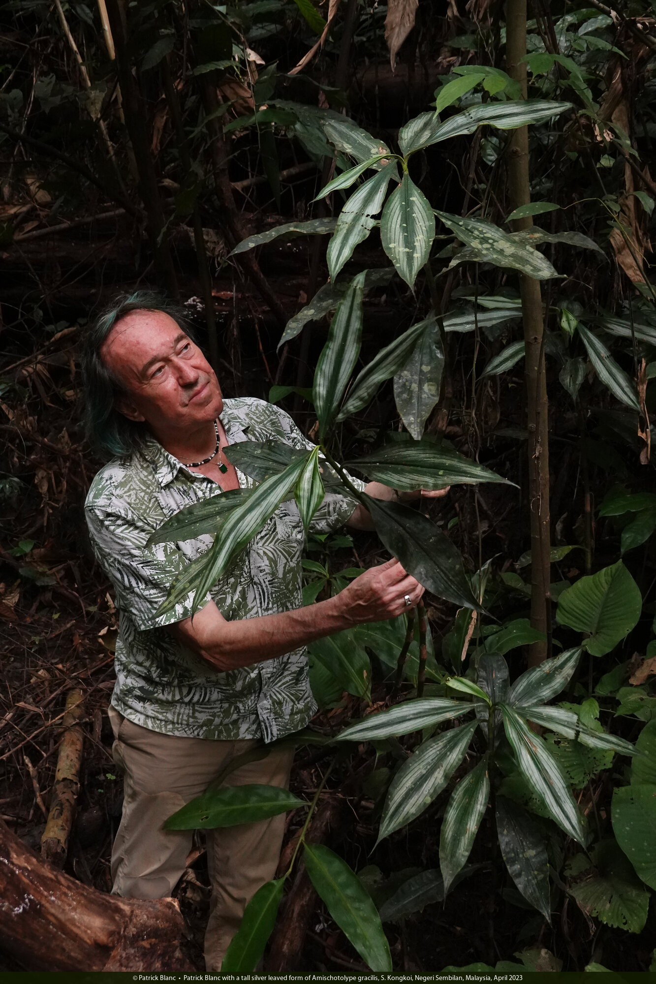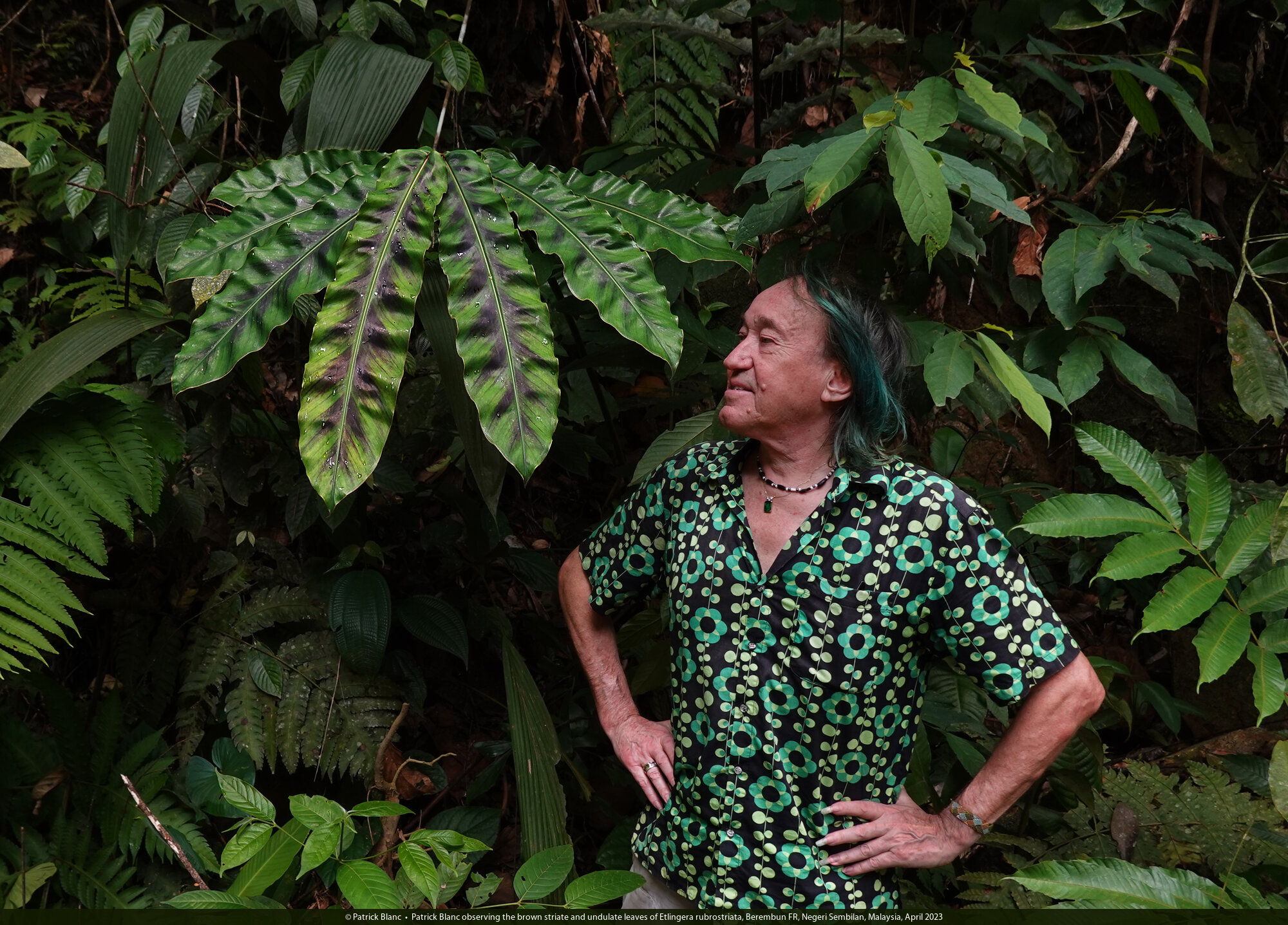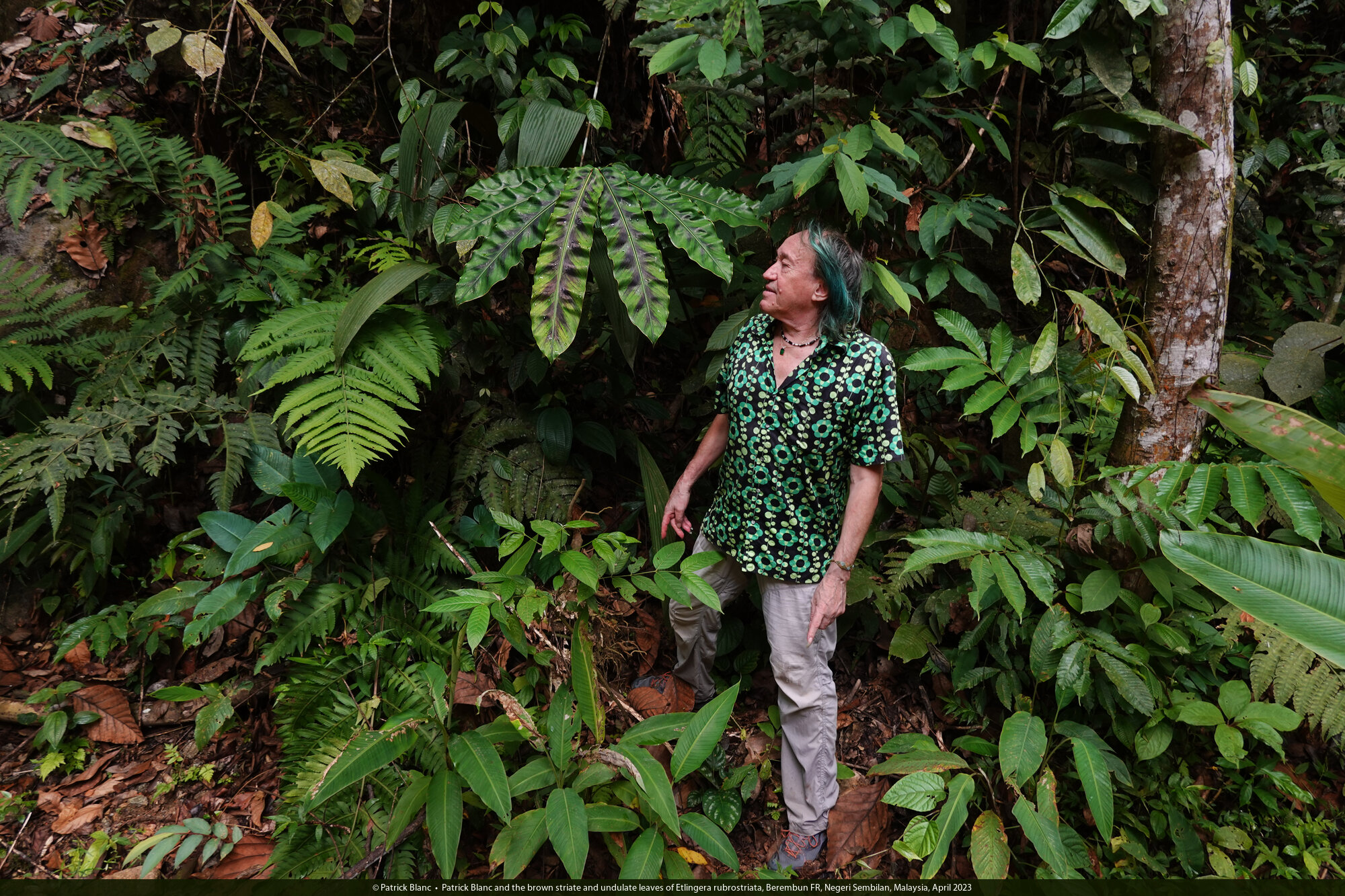 Patrick Blanc observing the brown striate and undulate leaves of Etlingera rubrostriata, Berembun FR, Negeri Sembilan, Malaysia, April 2023