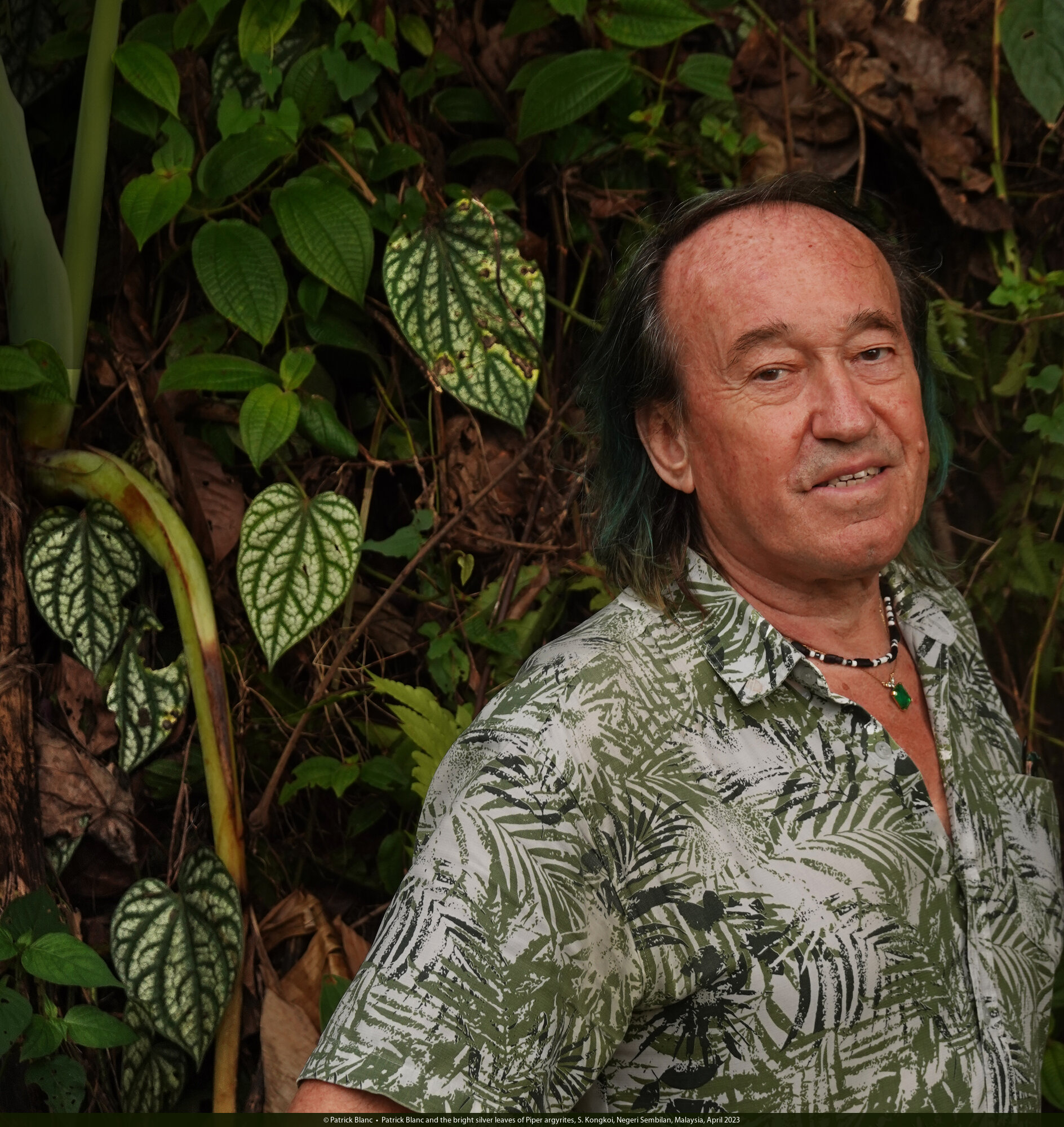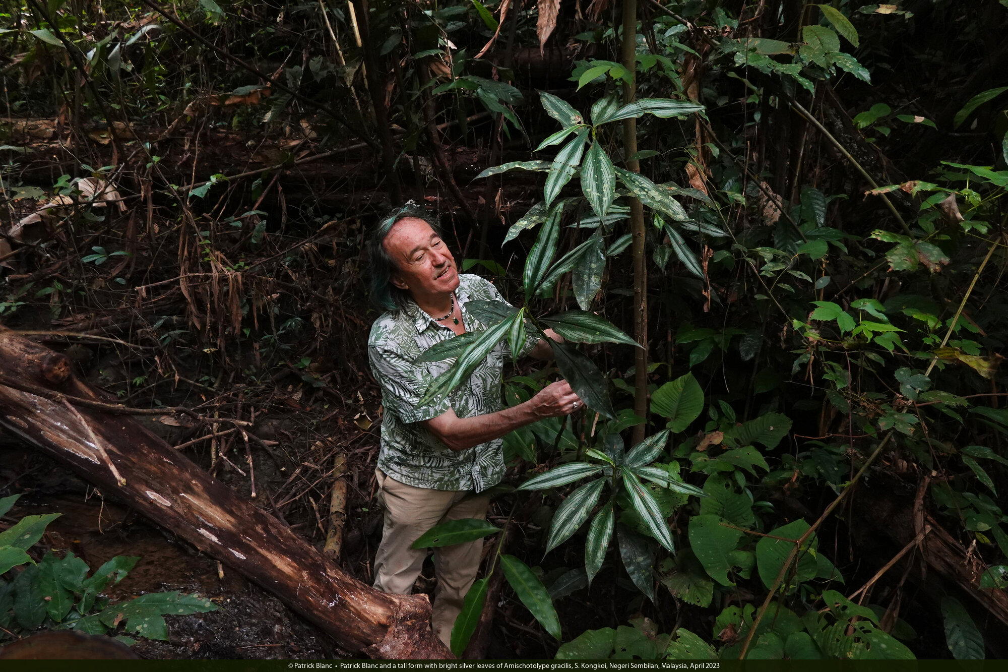 Patrick Blanc and the bright silver leaves of Piper argyrites, S. Kongkoi, Negeri Sembilan, Malaysia, April 2023