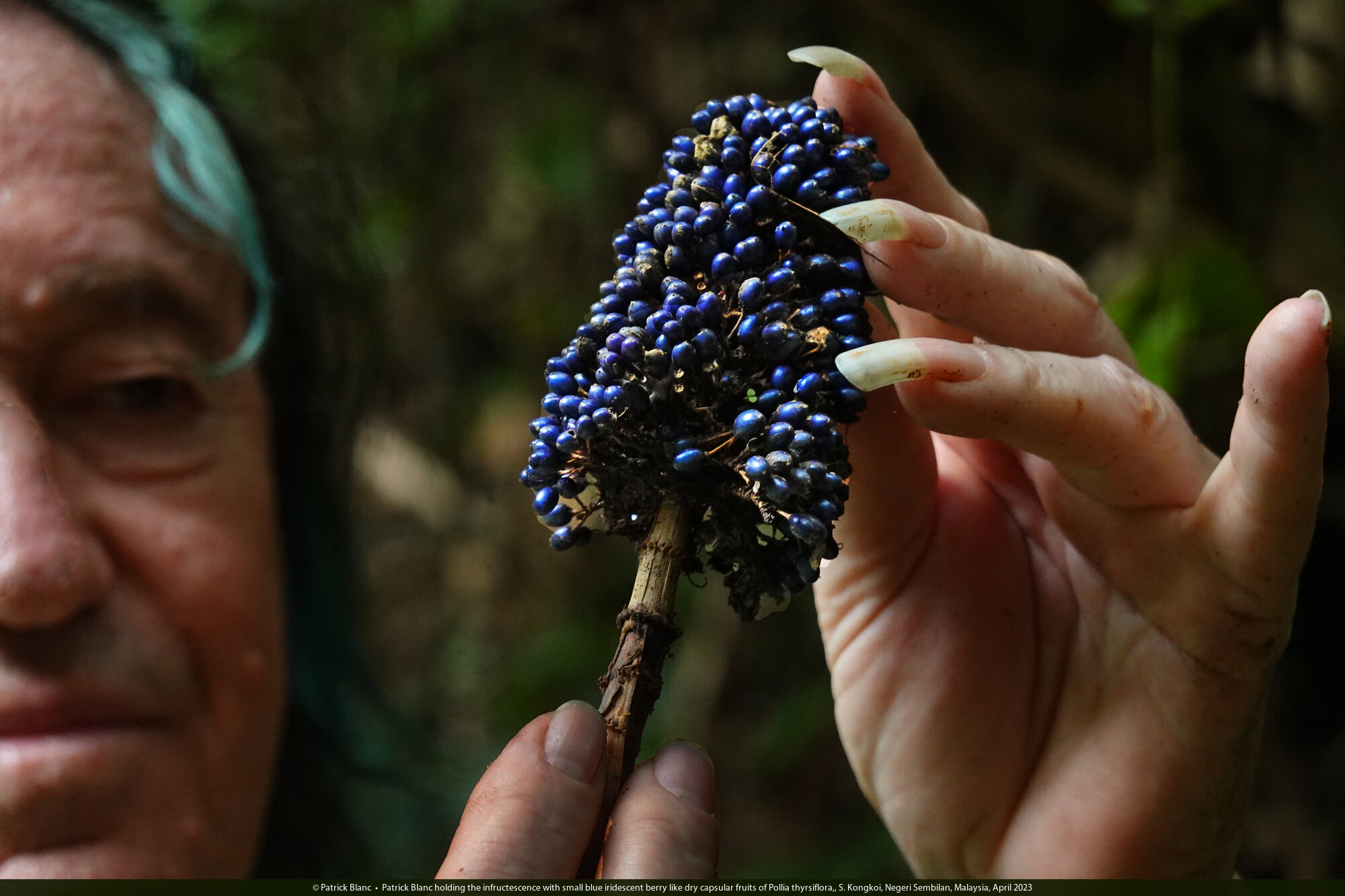Patrick Blanc holding the infructescence with small blue iridescent berry like dry capsular fruits of Pollia thyrsiflora,, S. Kongkoi, Negeri Sembilan, Malaysia, April 2023