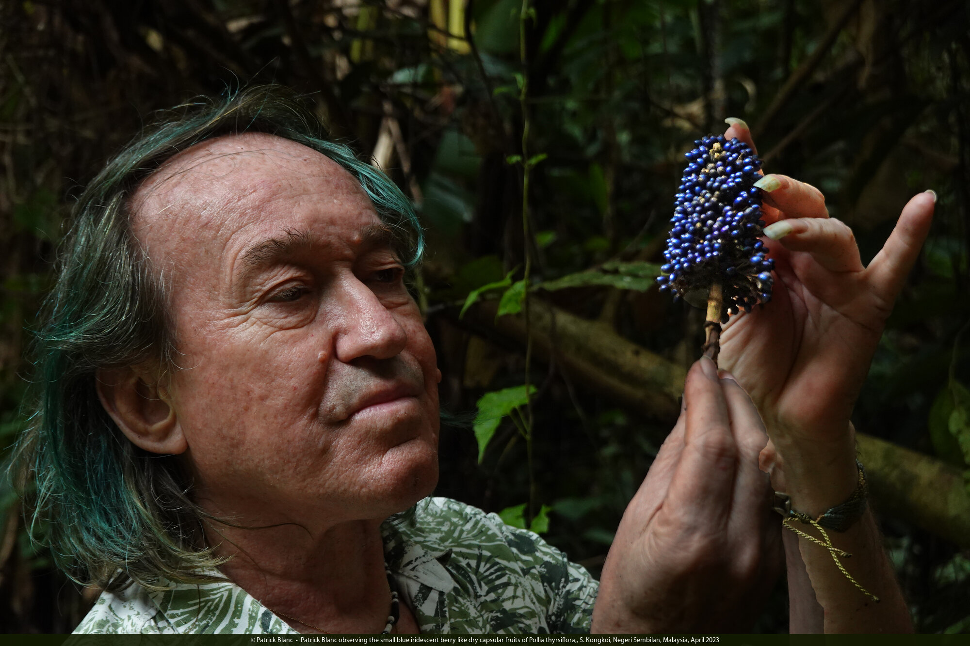 Patrick Blanc observing the small blue iridescent berry like dry capsular fruits of Pollia thyrsiflora,, S. Kongkoi, Negeri Sembilan, Malaysia, April 2023