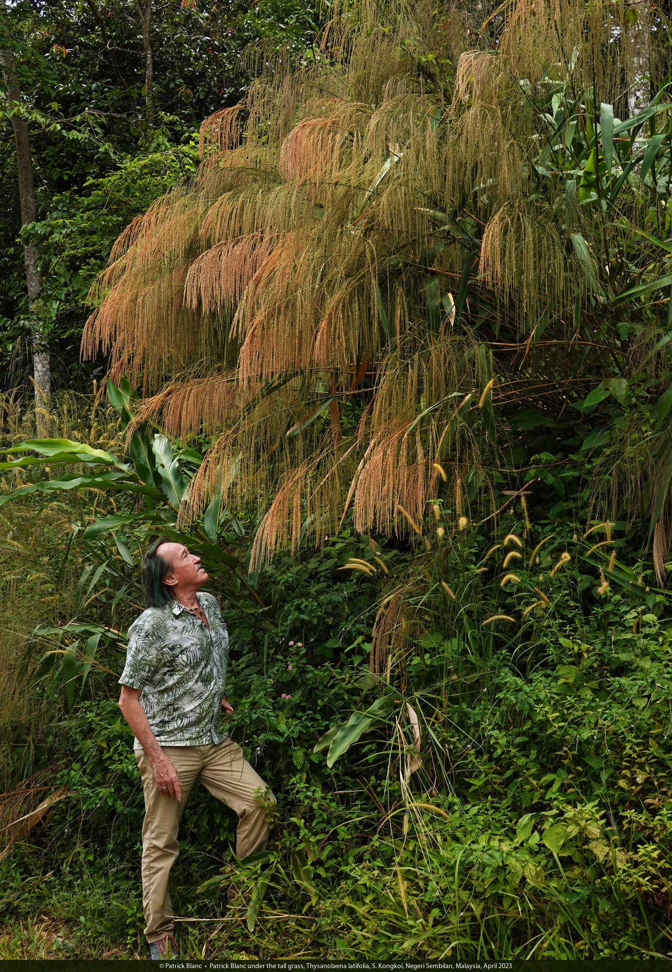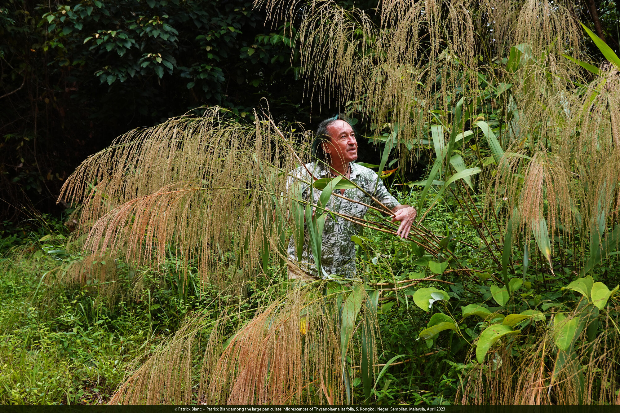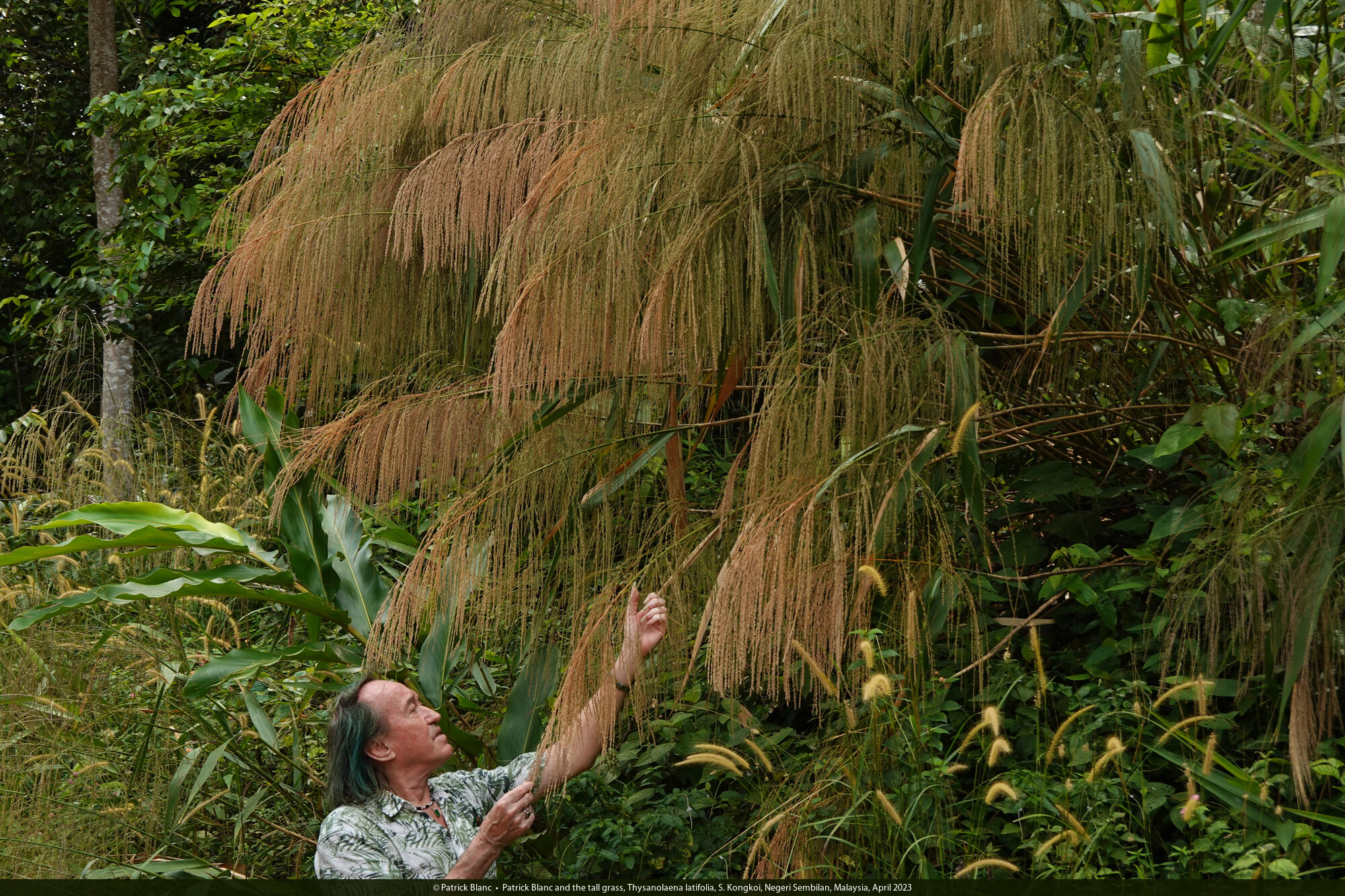 Patrick Blanc and the tall grass, Thysanolaena latifolia, S. Kongkoi, Negeri Sembilan, Malaysia, April 2023