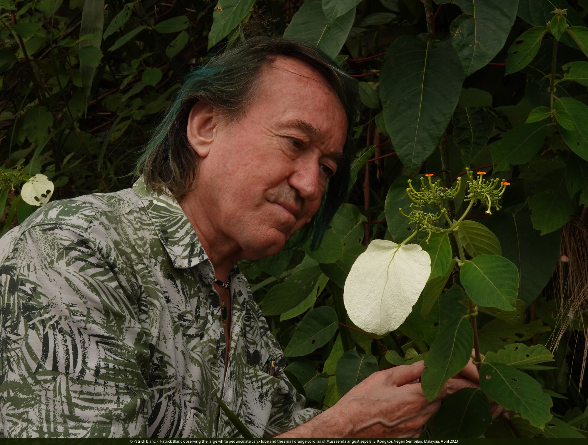 Patrick Blanc observing the large white pedunculate calyx lobe and the small orange corollas of Mussaenda angustisepala, S. Kongkoi, Negeri Sembilan, Malaysia, April 2023