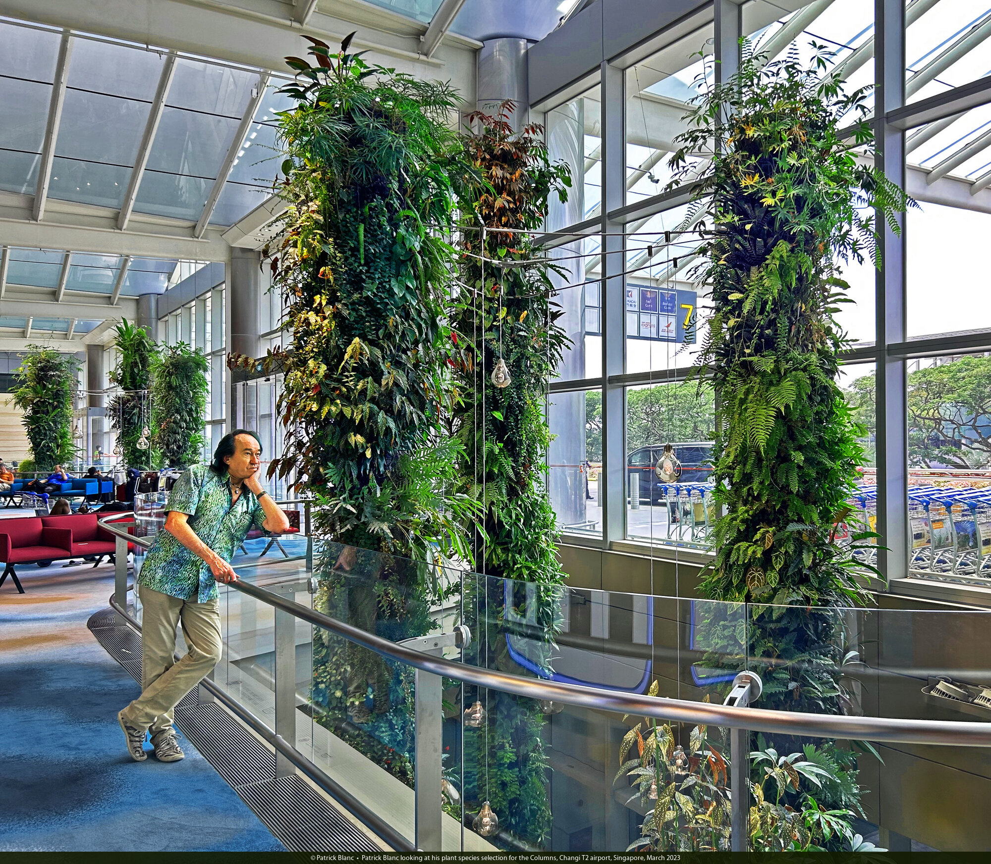 Patrick Blanc with Ong Sim Lian, Khaja Nazimuddeen, Dorothy Lim and Qian Yi Lee, checking the healthy growth of plants on the columns, Changi T2 airport, Singapore, March 2023