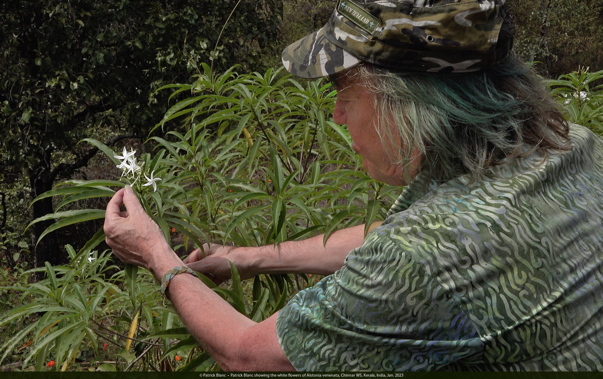 Patrick Blanc showing the white flowers of Alstonia venenata, Chinnar WS, Kerala, India, Jan. 2023