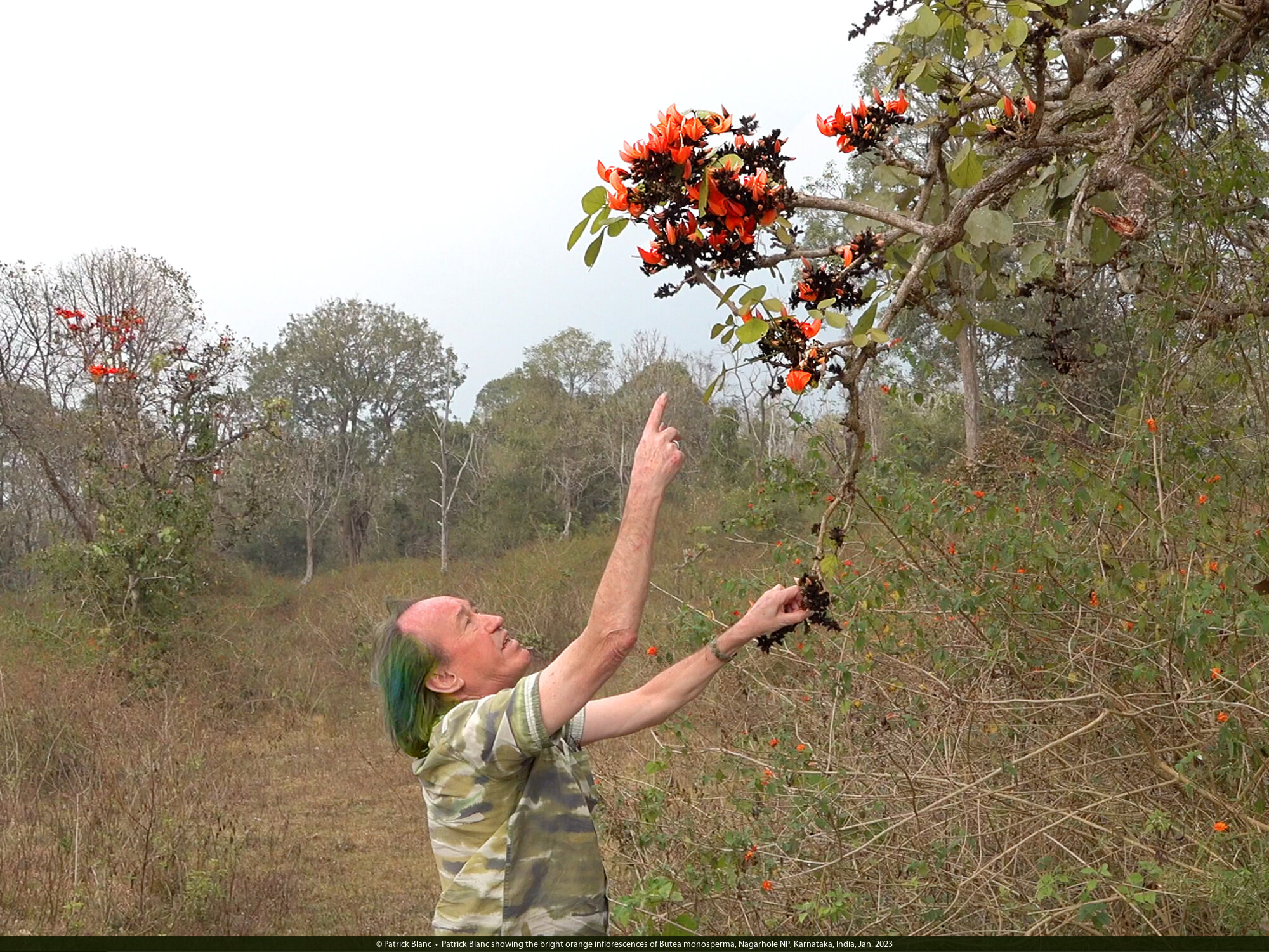 Patrick Blanc showing the bright orange inflorescences of Butea monosperma, Nagarhole NP, Karnataka, India, Jan. 2023