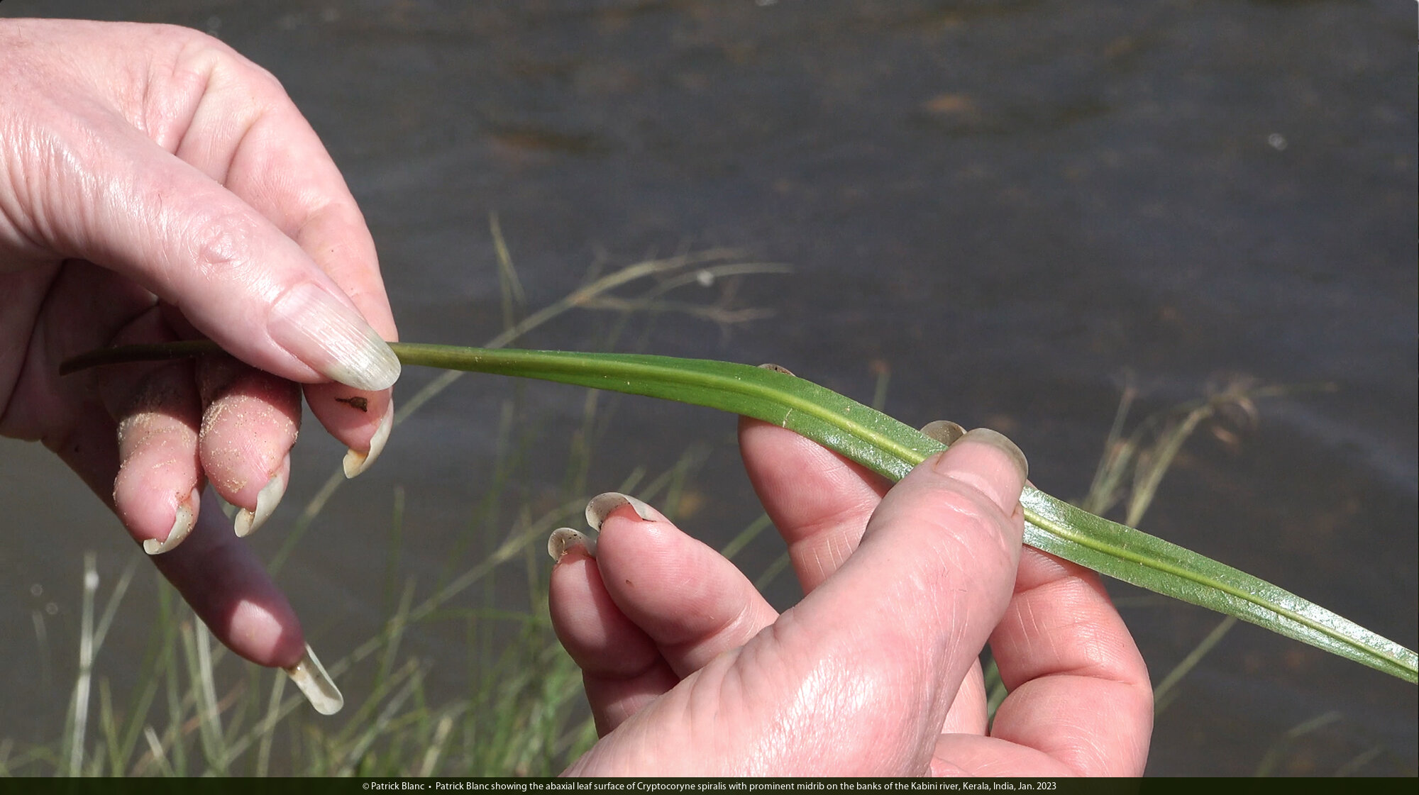Patrick Blanc showing the abaxial leaf surface of Cryptocoryne spiralis with prominent midrib on the banks of the Kabini river, Kerala, India, Jan. 2023