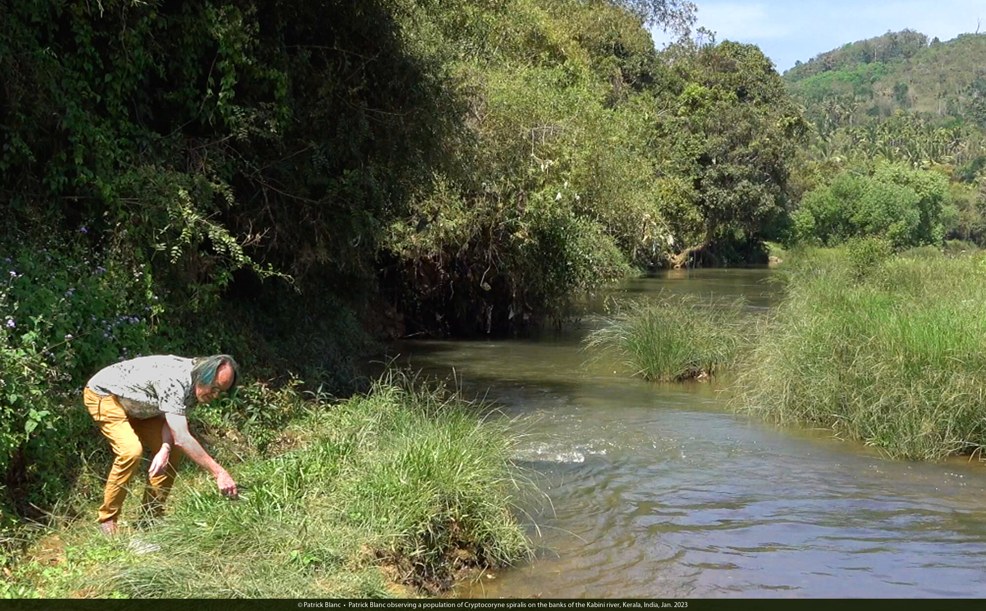 Patrick Blanc observing a population of Cryptocoryne spiralis on the banks of the Kabini river, Kerala, India, Jan. 2023