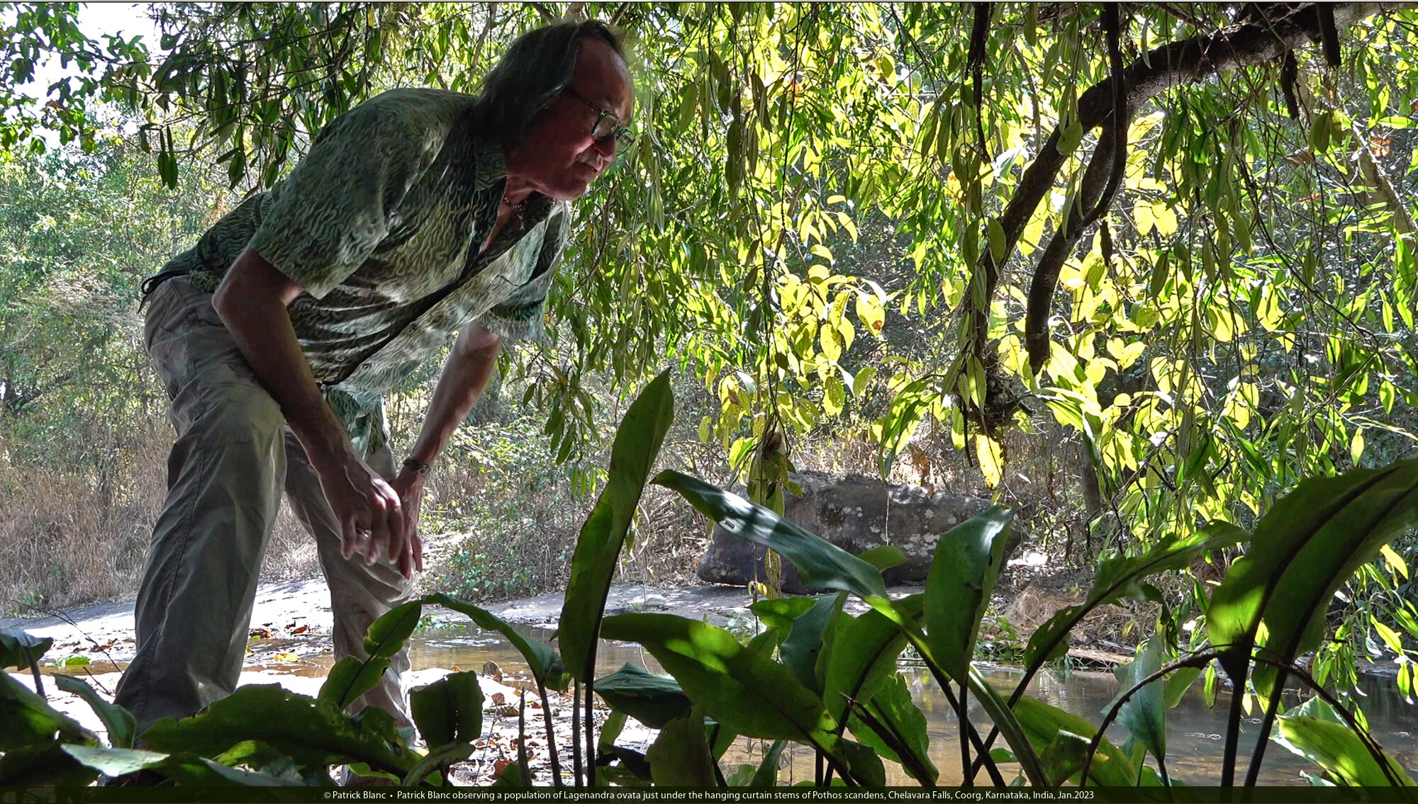 Patrick Blanc observing a population of Lagenandra ovata just under the hanging curtain stems of Pothos scandens, Chelavara Falls, Coorg, Karnataka, India, Jan.2023