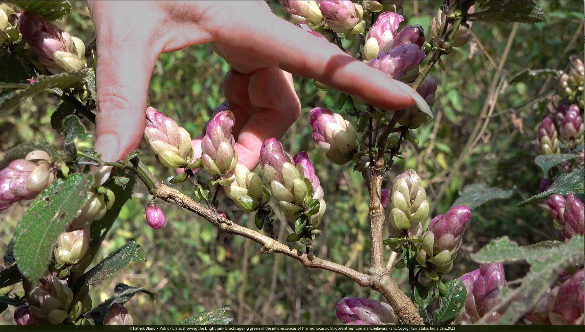Patrick Blanc showing the bright pink bracts ageing green of the inflorescences of the monocarpic Strobilanthes lupulina, Chelavara Falls, Coorg, Karnataka, India, Jan.2023