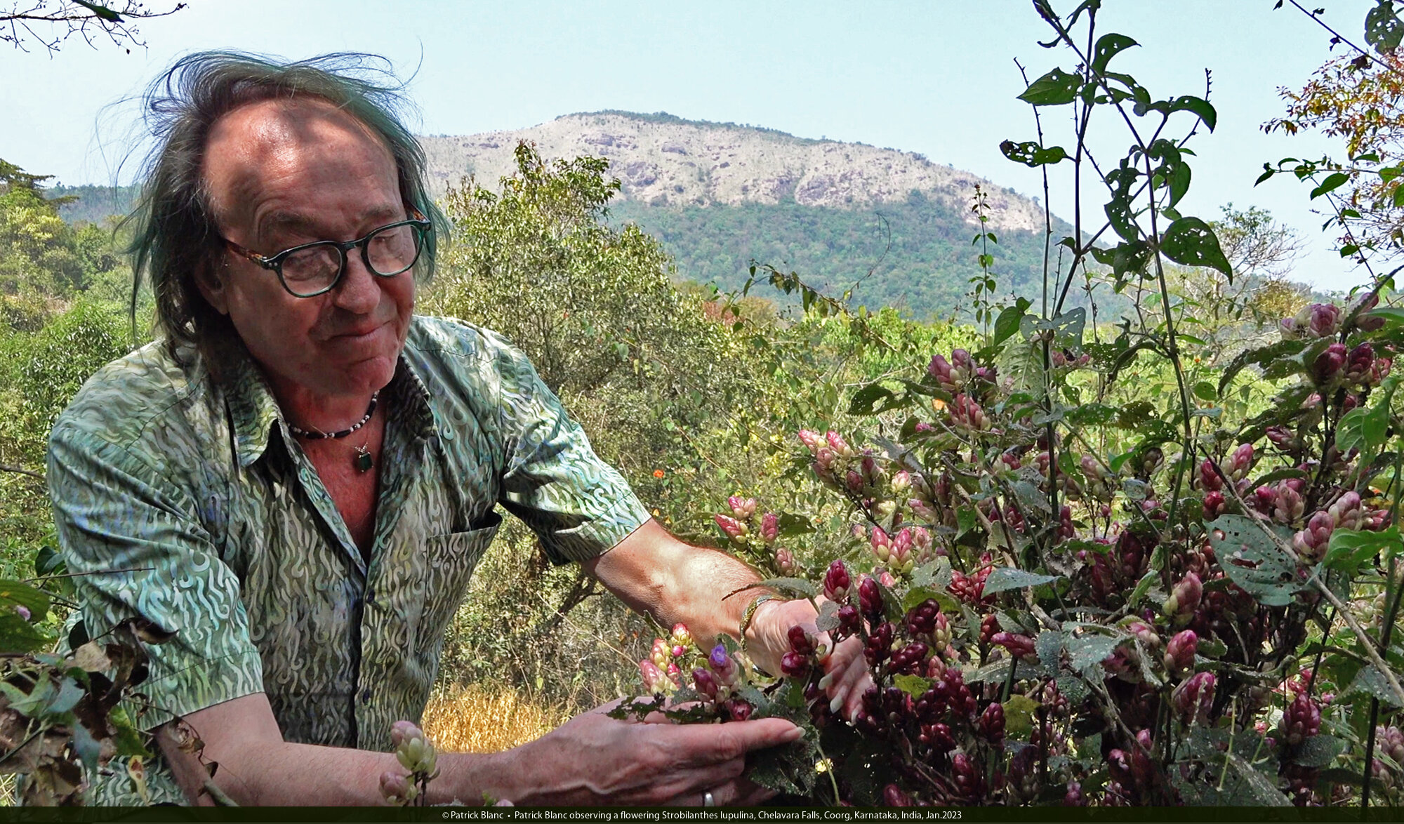 Patrick Blanc observing a flowering Strobilanthes lupulina, Chelavara Falls, Coorg, Karnataka, India, Jan.2023