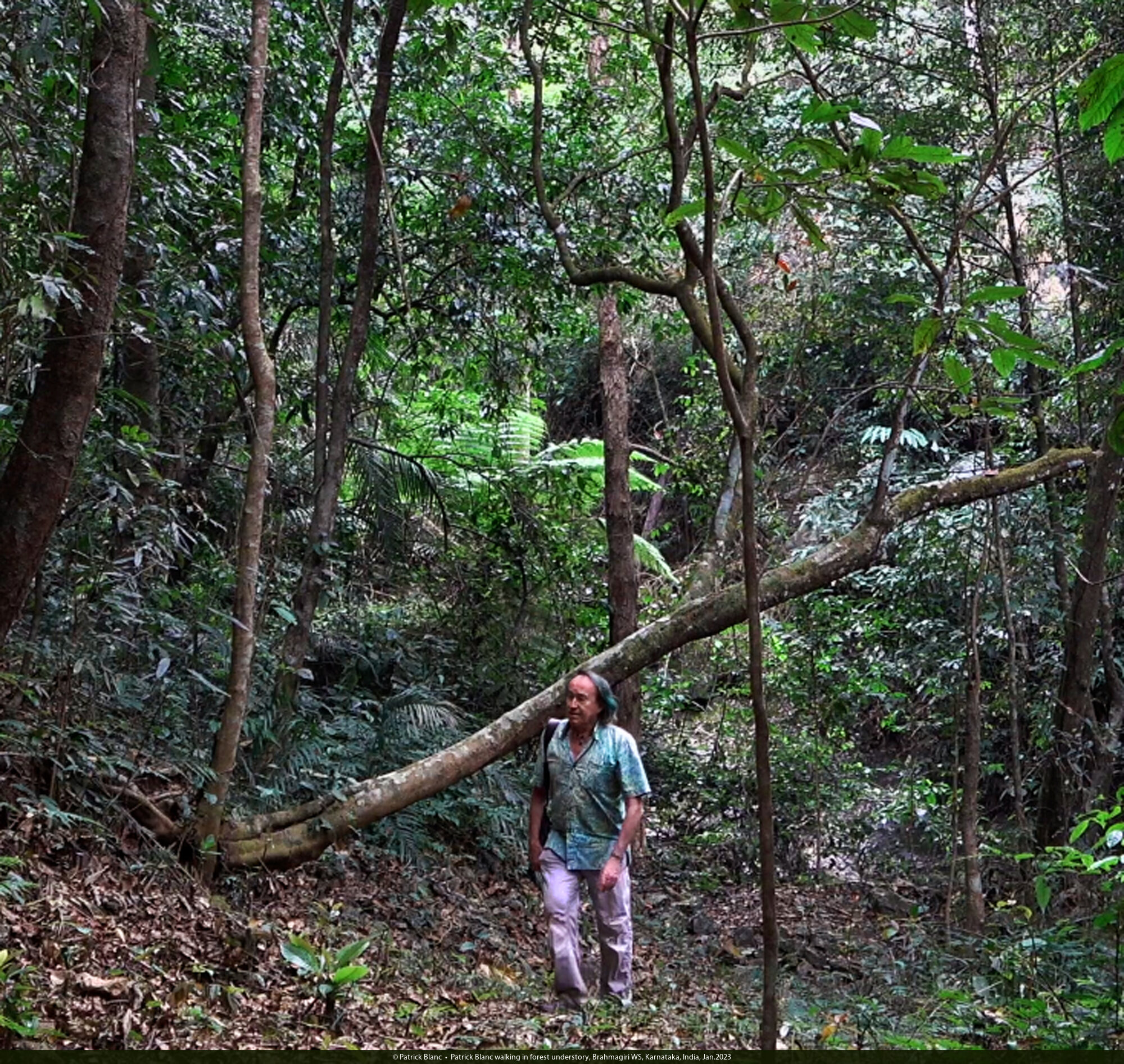 Patrick Blanc walking in forest understory, Brahmagiri WS, Karnataka, India, Jan.2023