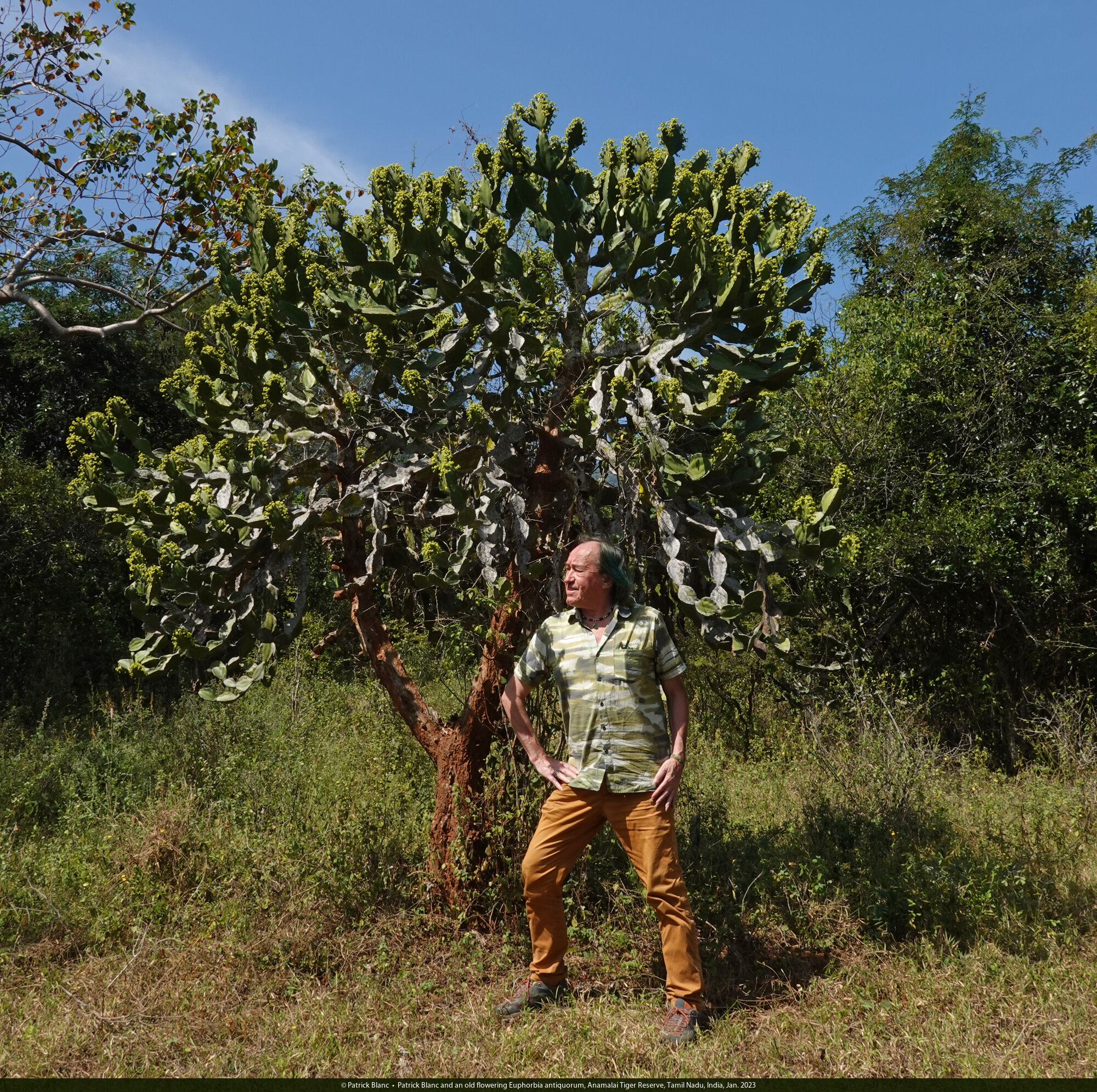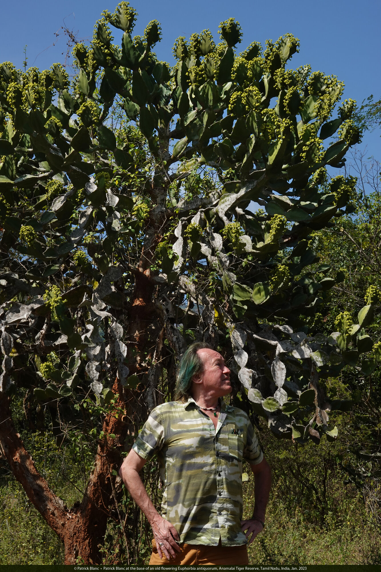 Patrick Blanc at the base of an old flowering Euphorbia antiquorum, Anamalai Tiger Reserve, Tamil Nadu, India, Jan. 2023