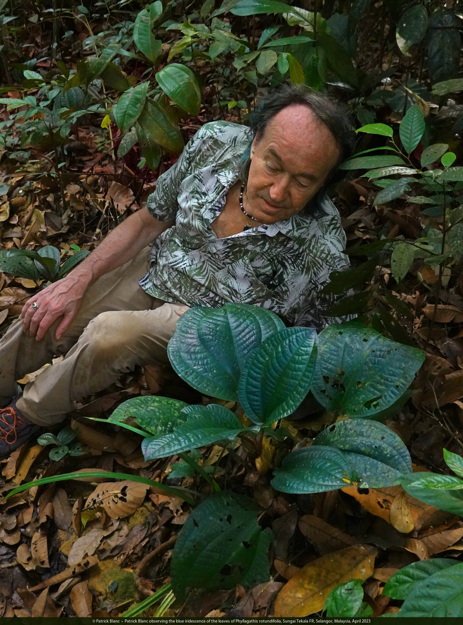 Patrick Blanc observing the blue iridescence of the leaves of Phyllagathis rotundifolia, Sungai Tekala FR, Selangor, Malaysia, April 2023