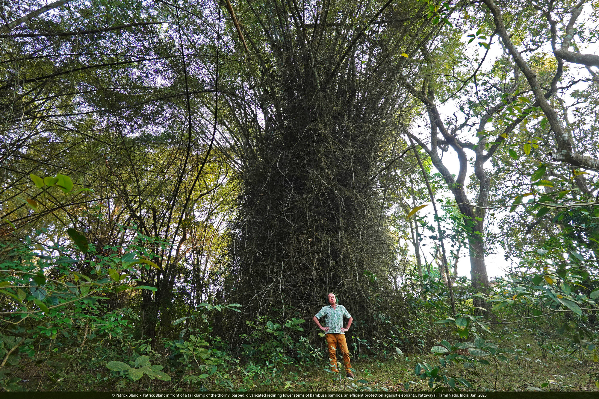 Patrick Blanc in front of a tall clump of the thorny, barbed, divaricated reclining lower stems of Bambusa bambos, an efficient protection against elephants, Pattavayal, Tamil Nadu, India, Jan. 2023