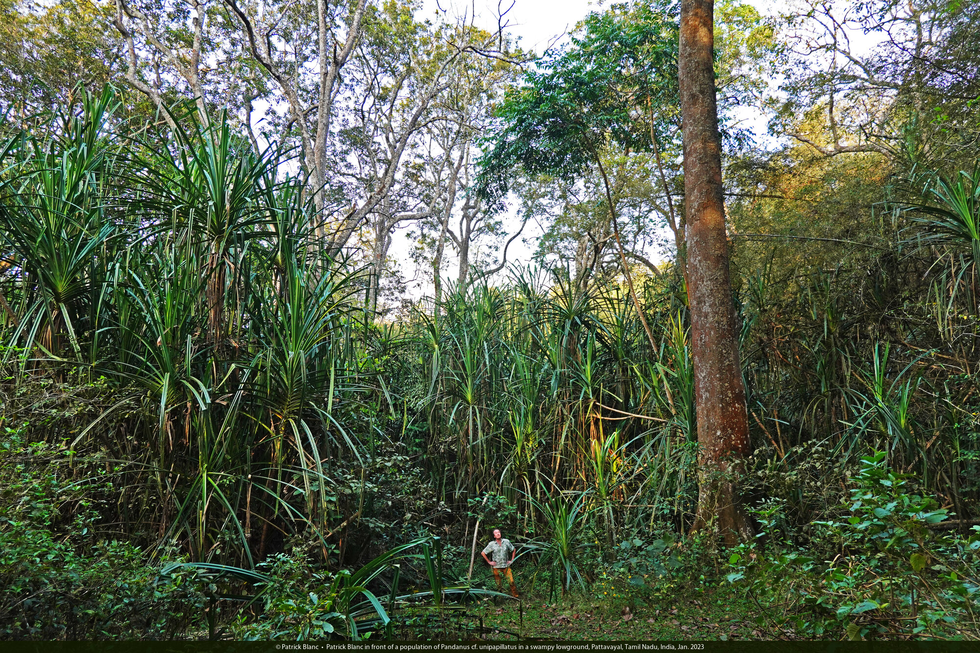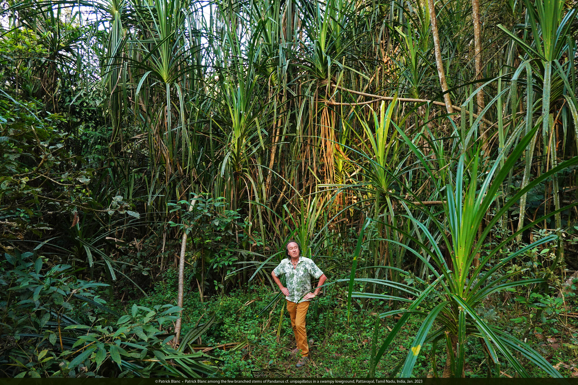 Patrick Blanc in front of a population of Pandanus cf. unipapillatus in a swampy lowground, Pattavayal, Tamil Nadu, India, Jan. 2023