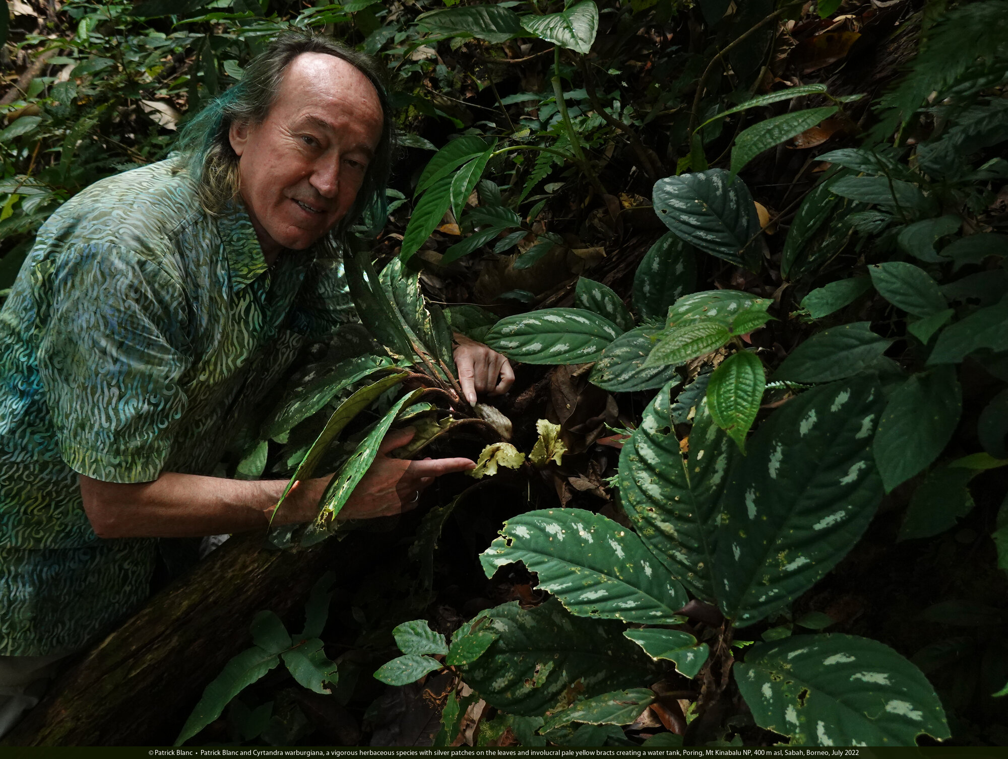Patrick Blanc observing Cyrtandra warburgiana, the involucral pale yellow bracts creating a water tank in which the berry fruits will be maturing, Poring, Mt Kinabalu NP, 400 m asl, Sabah, Borneo, July 2022