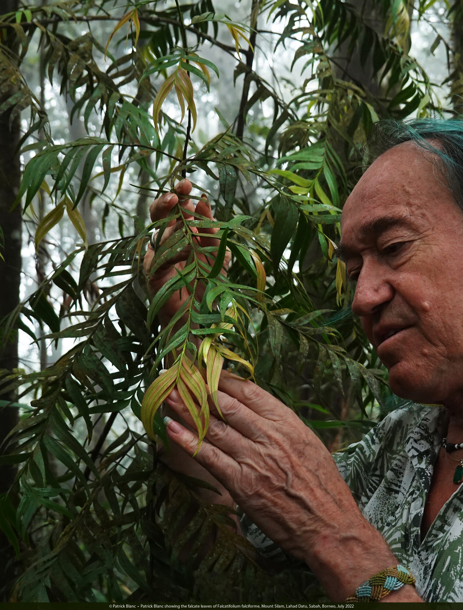 Patrick Blanc showing the falcate leaves of Falcatifolium falciforme, Mount Silam, Lahad Datu, Sabah, Borneo, July 2022