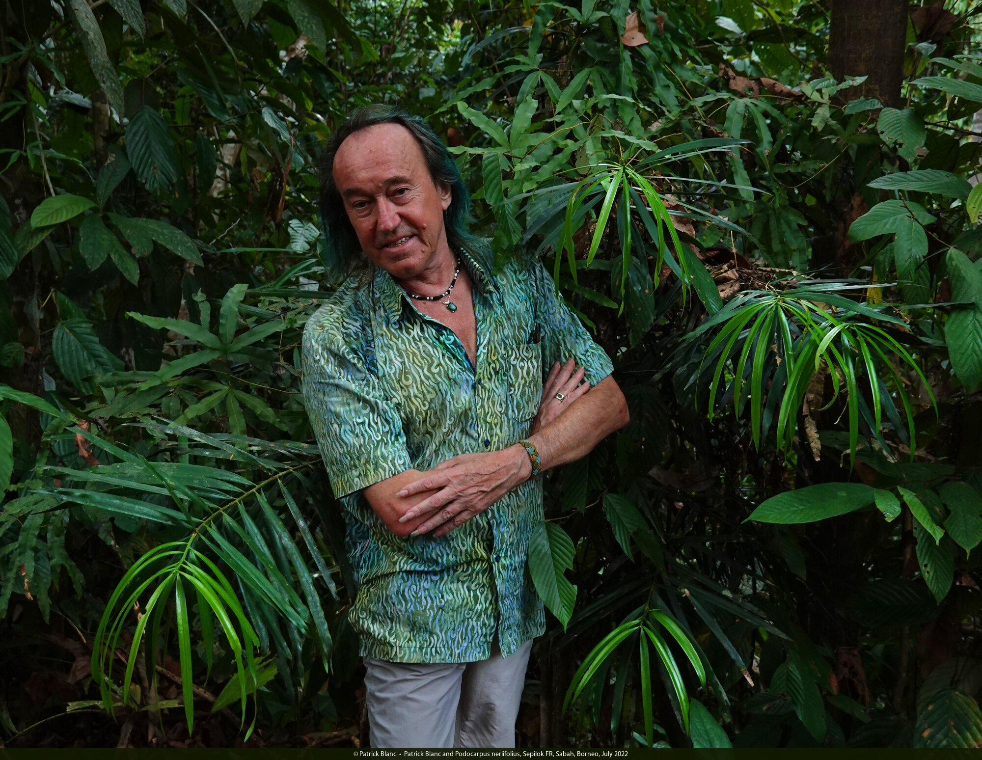 Patrick Blanc and Podocarpus neriifolius, Sepilok FR, Sabah, Borneo, July 2022