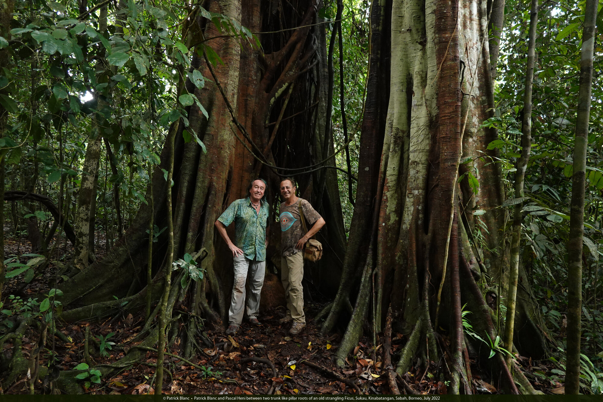 Patrick Blanc and Pascal Heni between two trunk like pillar roots of an old strangling Ficus, Sukau, Kinabatangan, Sabah, Borneo, July 2022