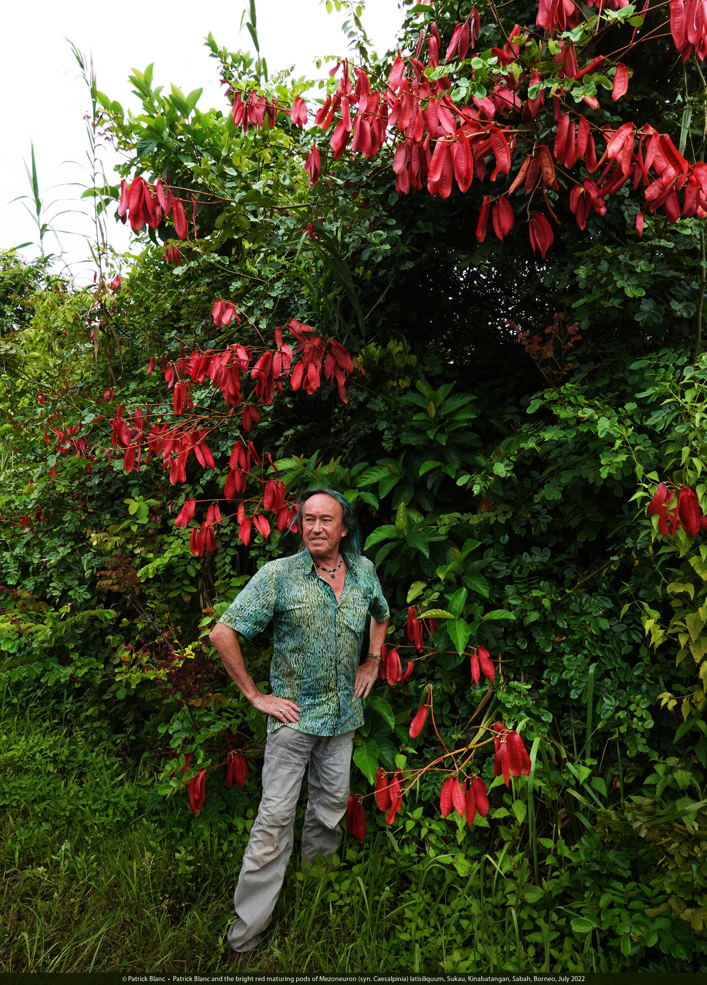 Patrick Blanc and the bright red maturing pods of Mezoneuron (syn. Caesalpinia) latisiliquum, Sukau, Kinabatangan, Sabah, Borneo, July 2022