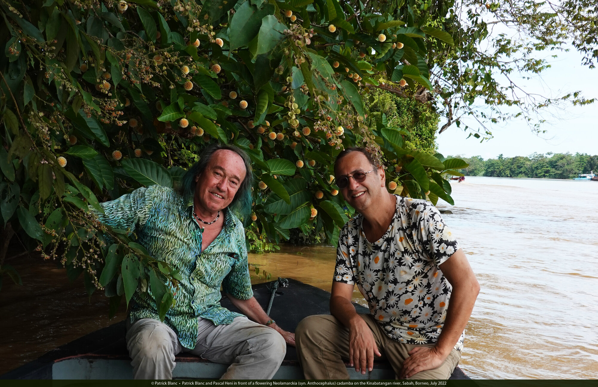 Patrick Blanc and Pascal Heni in front of a flowering Neolamarckia (syn. Anthocephalus) cadamba on the Kinabatangan river, Sabah, Borneo, July 2022