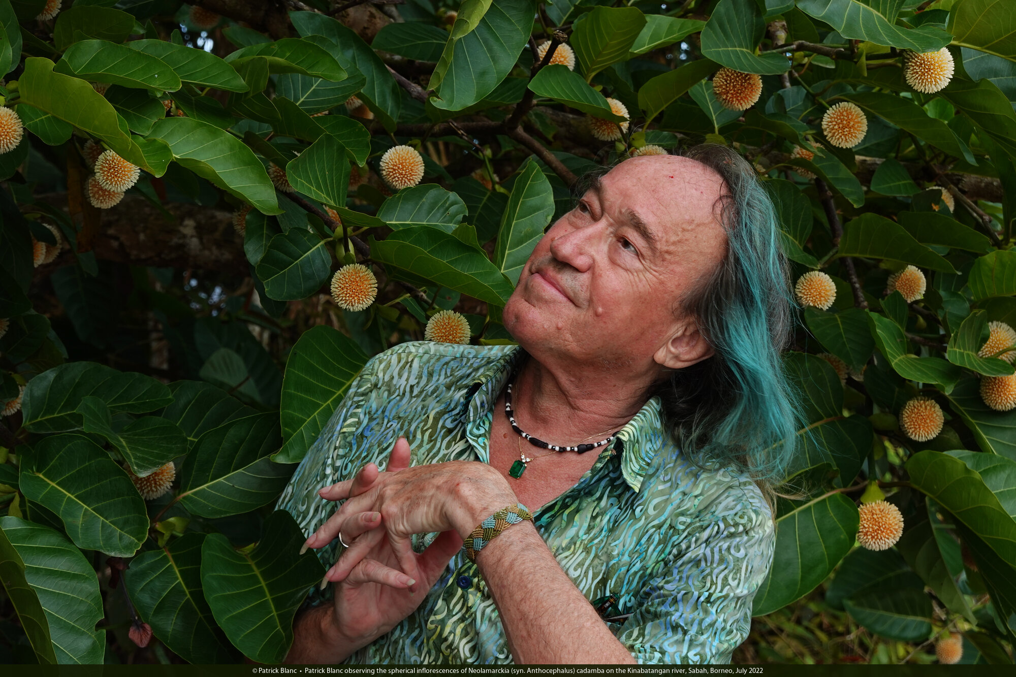 Patrick Blanc observing the spherical inflorescences of Neolamarckia (syn. Anthocephalus) cadamba on the Kinabatangan river, Sabah, Borneo, July 2022