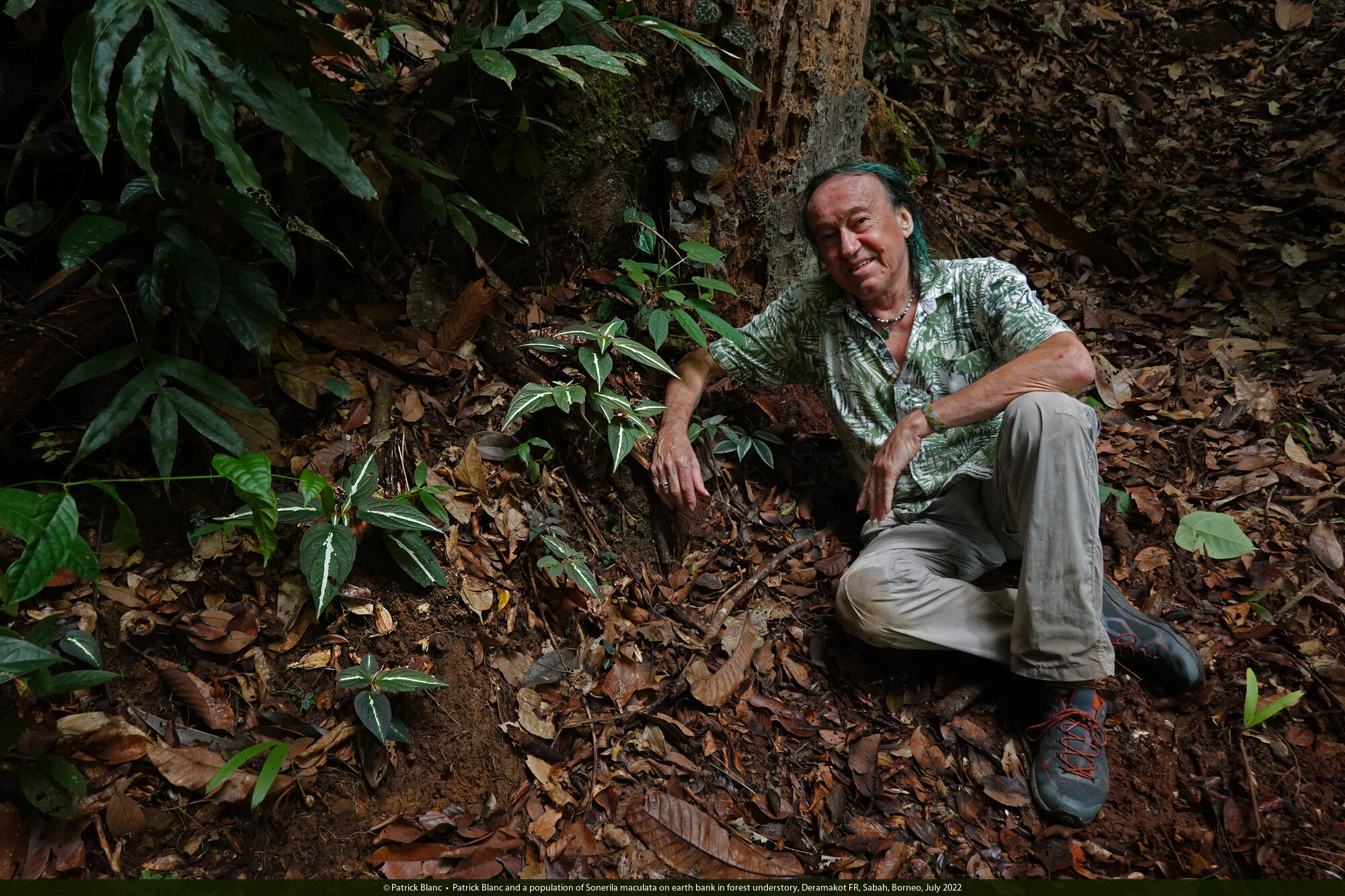 Patrick Blanc and a population of Sonerila maculata on earth bank in forest understory, Deramakot FR, Sabah, Borneo, July 2022