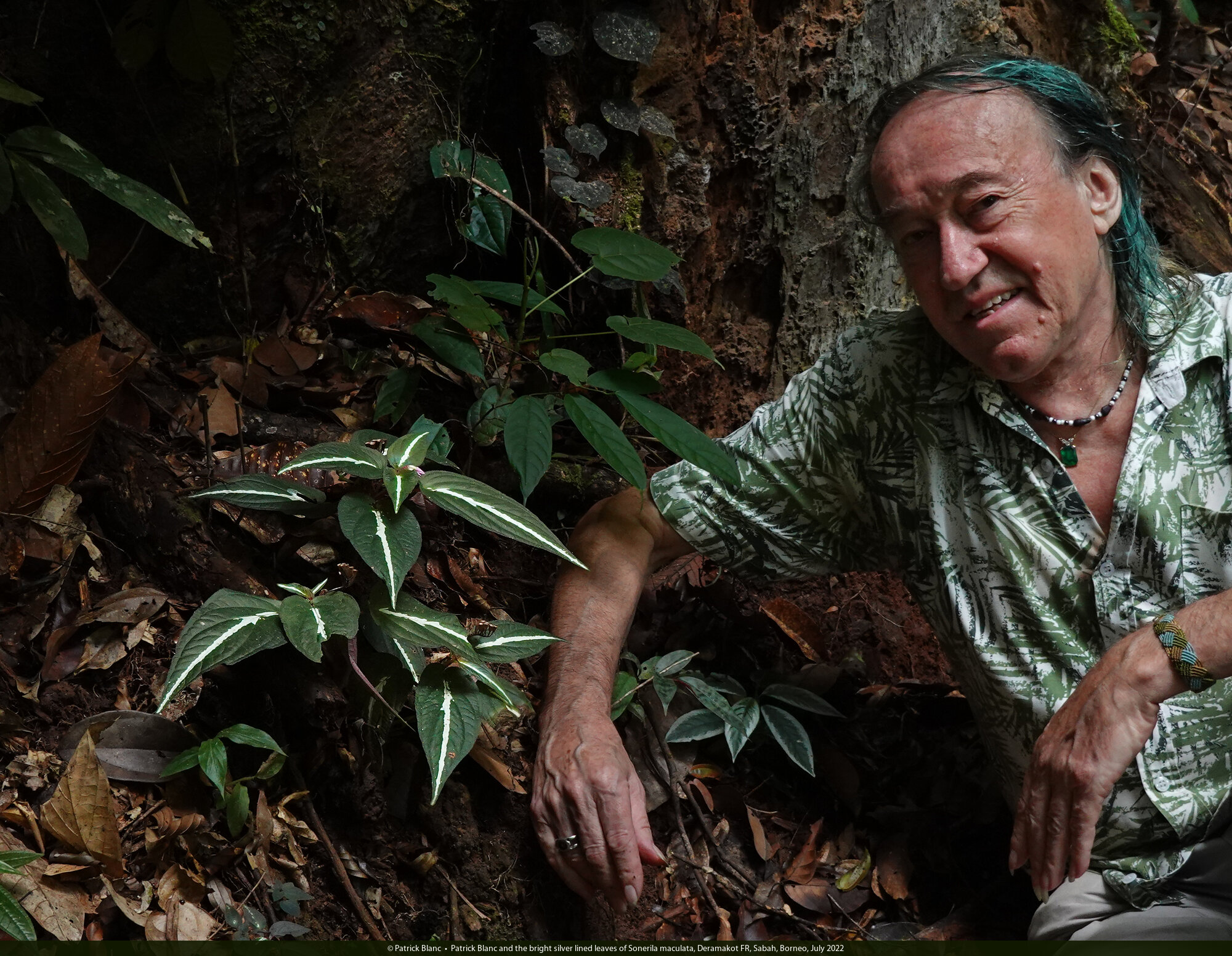 Patrick Blanc and the bright silver lined leaves of Sonerila maculata, Deramakot FR, Sabah, Borneo, July 2022