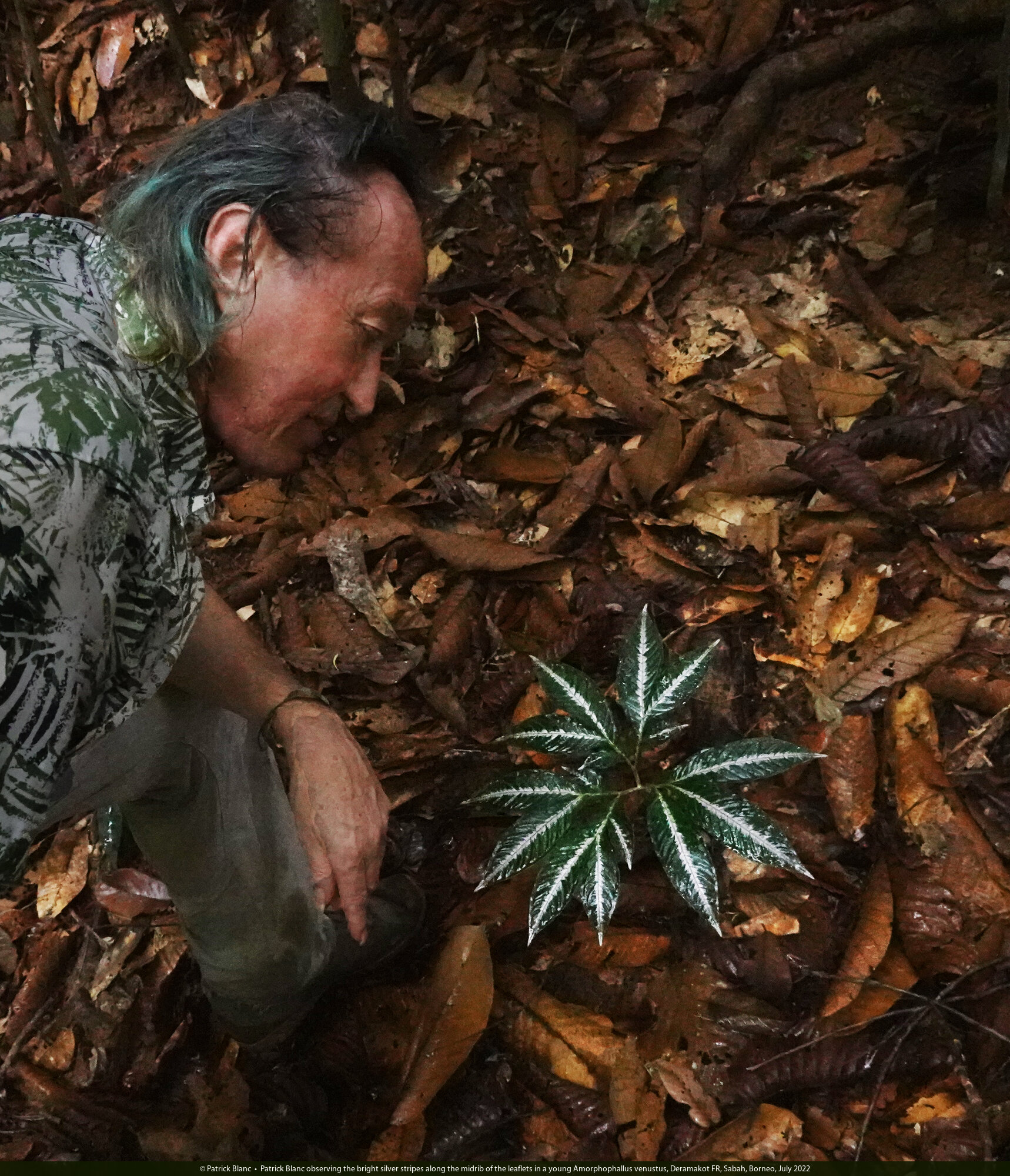 Patrick Blanc observing the bright silver stripes along the midrib of the leaflets in a young Amorphophallus venustus, Deramakot FR, Sabah, Borneo, July 2022