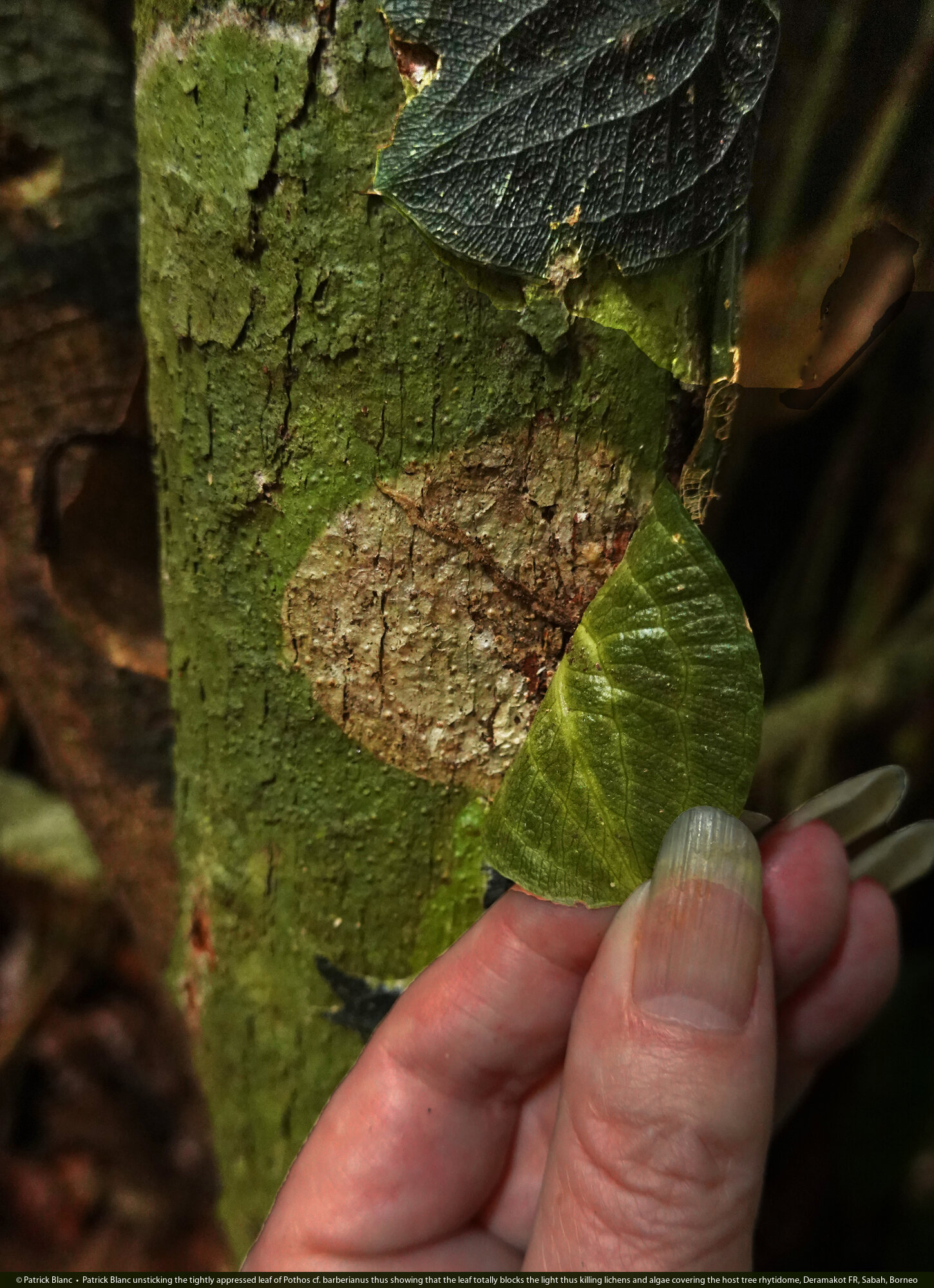 Patrick Blanc unsticking the tightly appressed leaf of Pothos cf. barberianus thus showing that the leaf totally blocks the light thus killing lichens and algae covering the host tree rhytidome, Deramakot FR, Sabah, Borneo