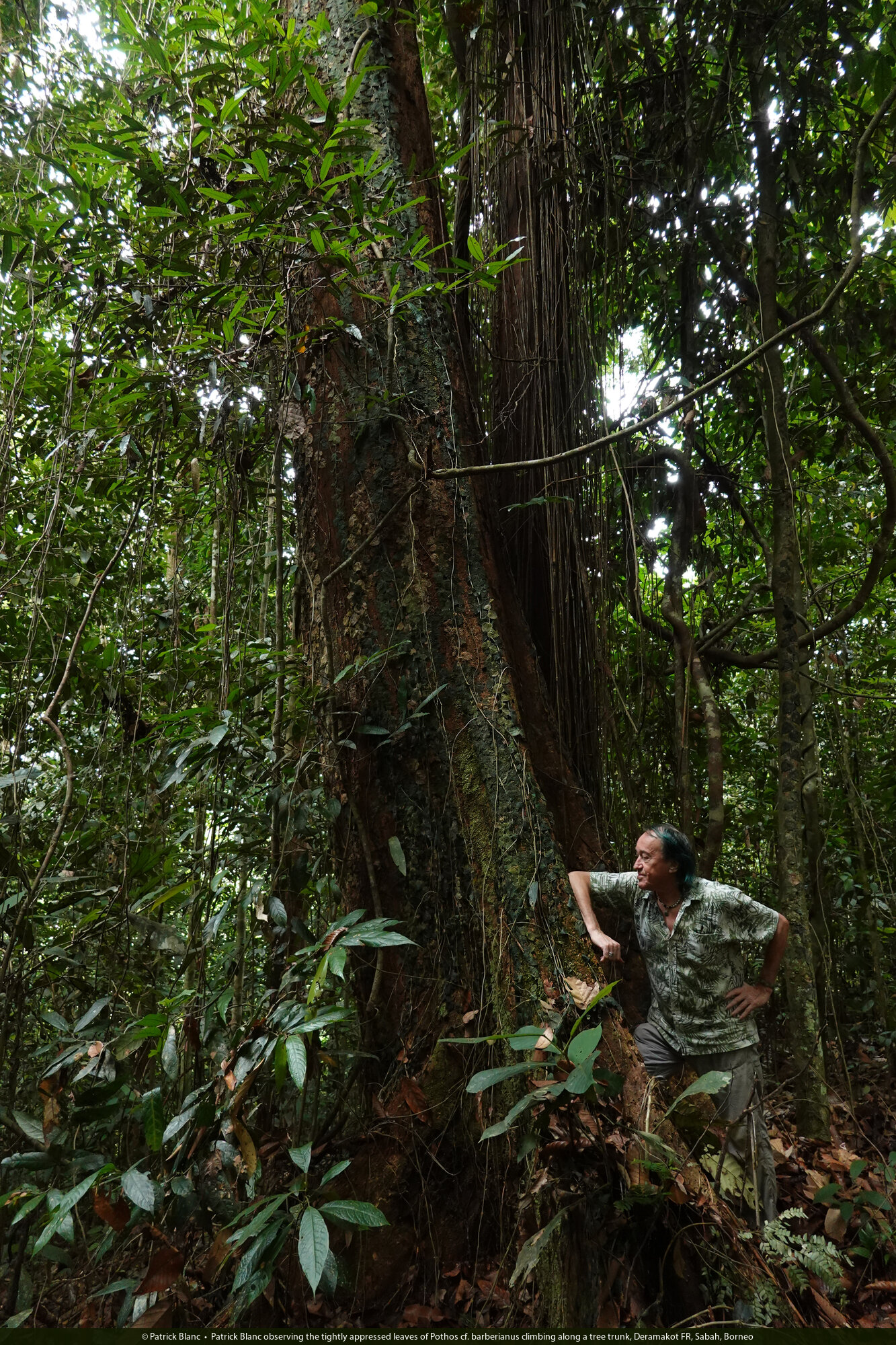 Patrick Blanc observing the tightly appressed leaves of Pothos cf. barberianus climbing along a tree trunk, Deramakot FR, Sabah, Borneo