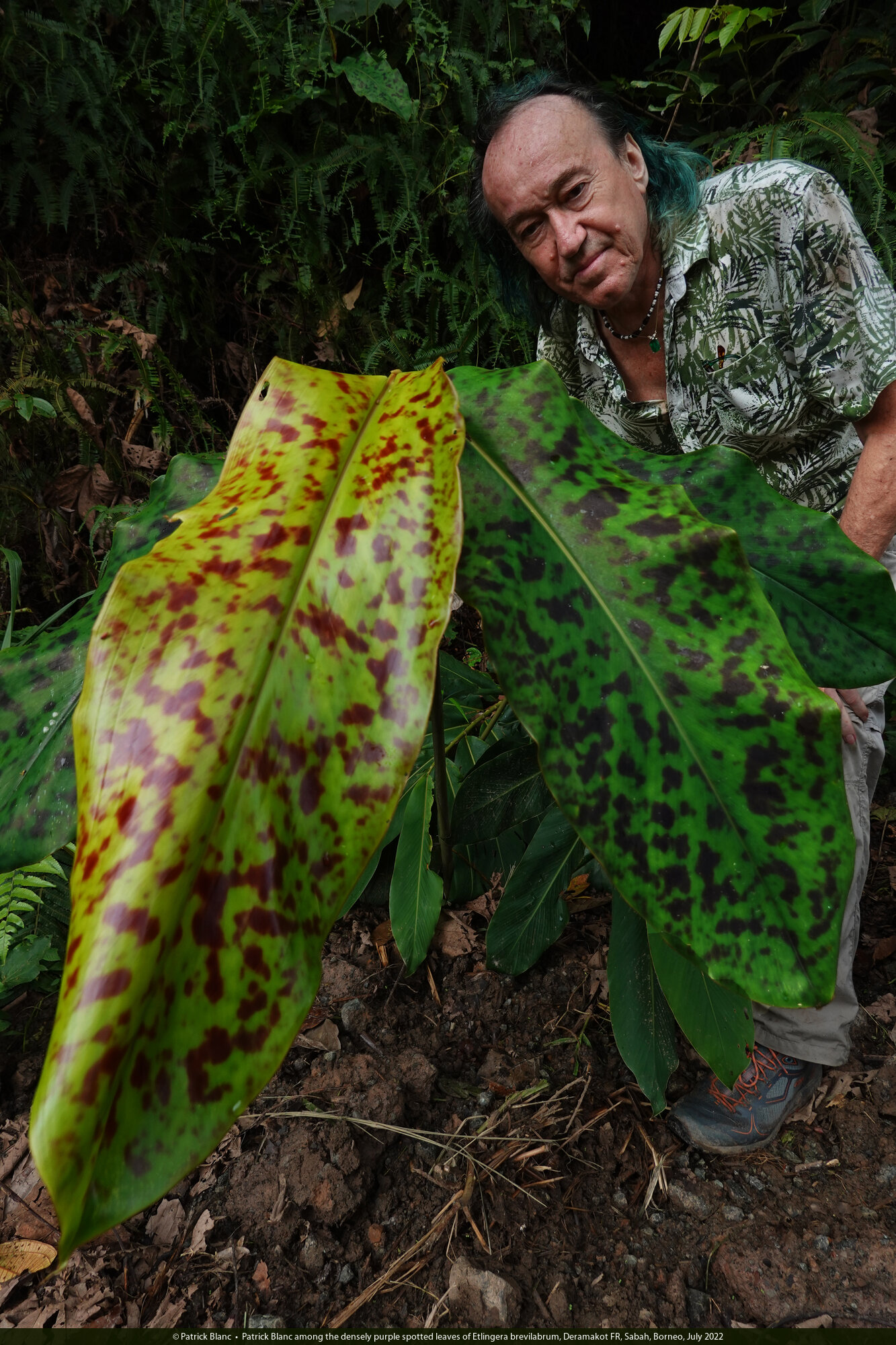 Patrick Blanc among the densely purple spotted leaves of Etlingera brevilabrum, Deramakot FR, Sabah, Borneo, July 2022