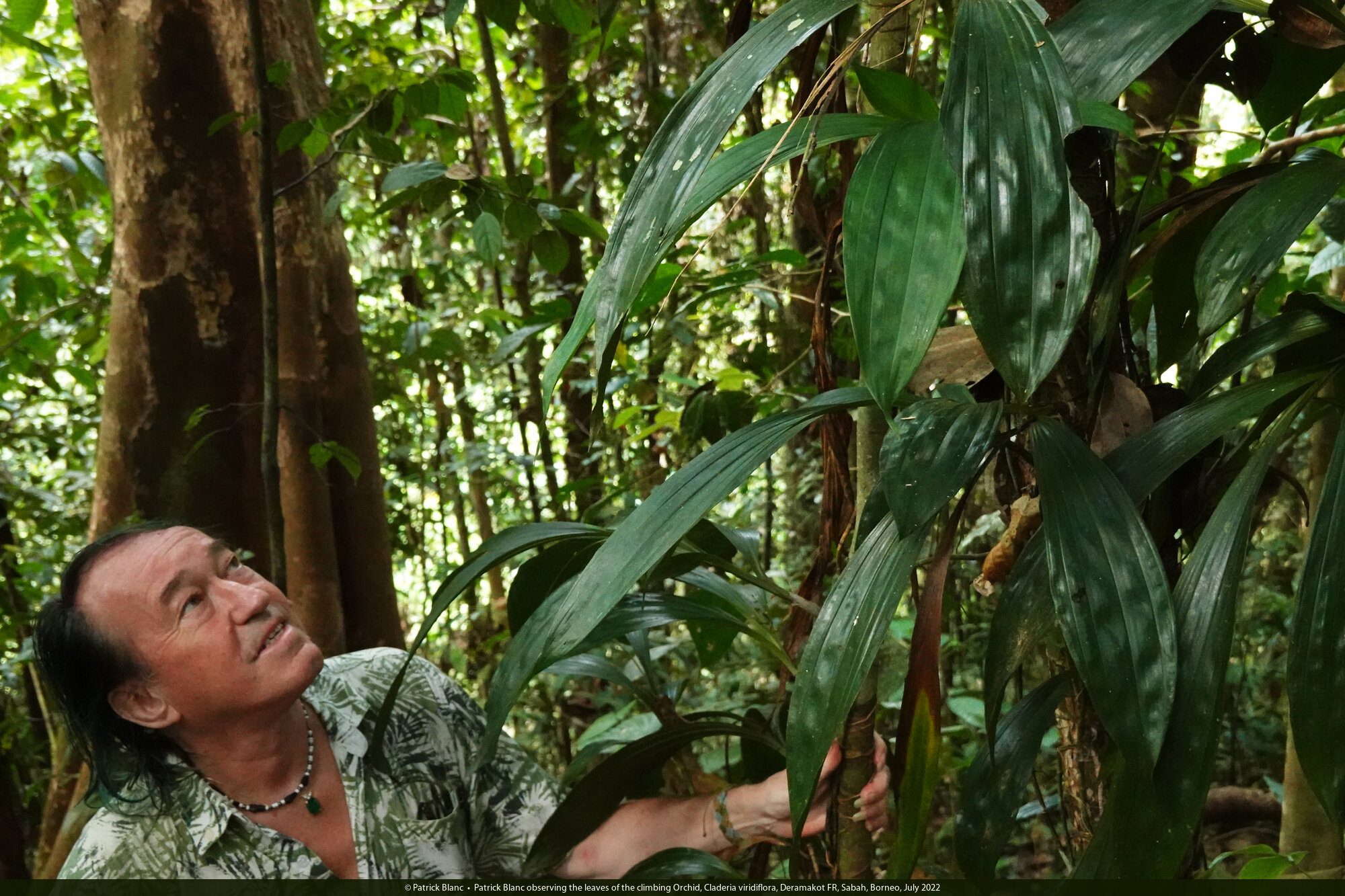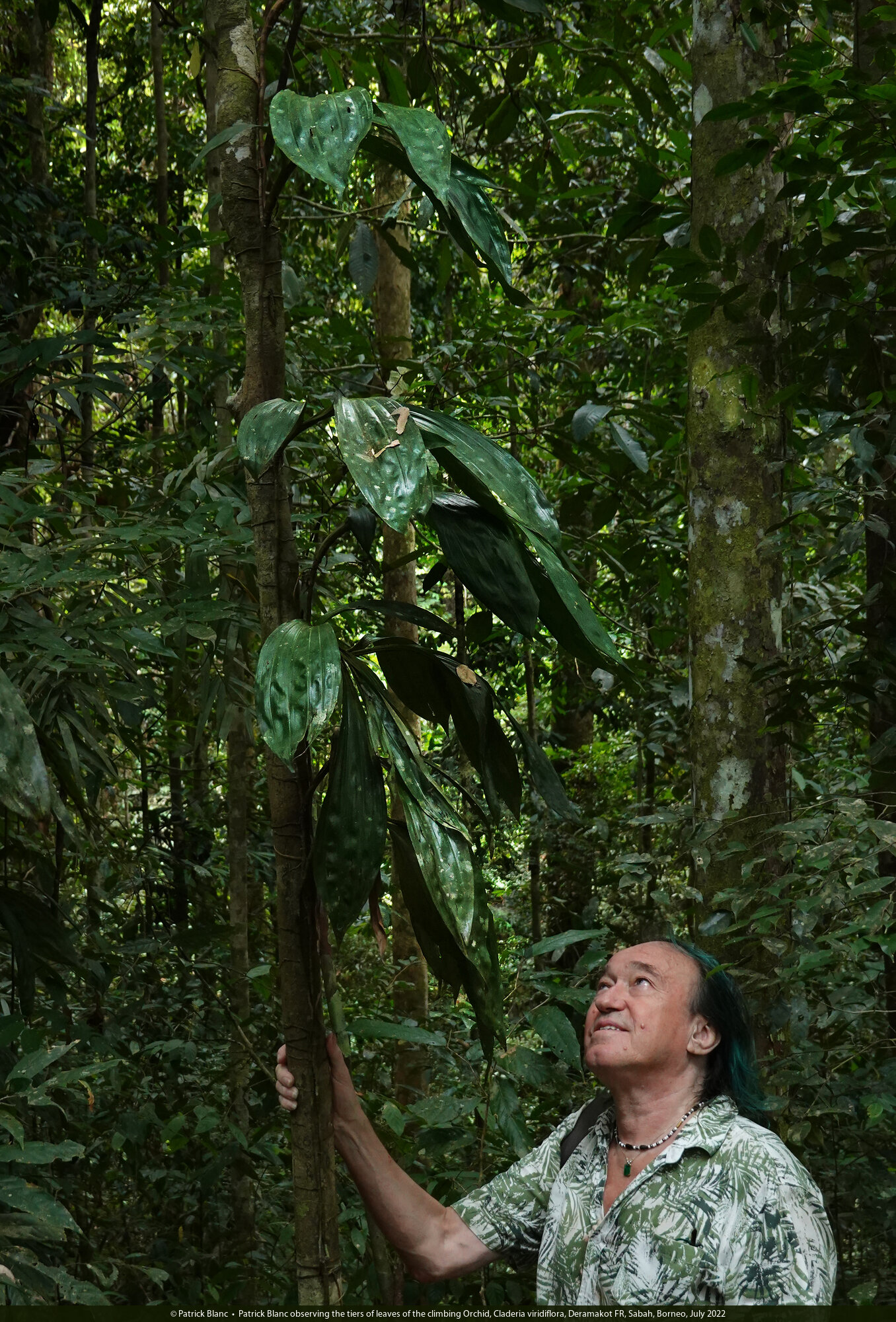 Patrick Blanc observing the tiers of leaves of the climbing Orchid, Claderia viridiflora, Deramakot FR, Sabah, Borneo, July 2022