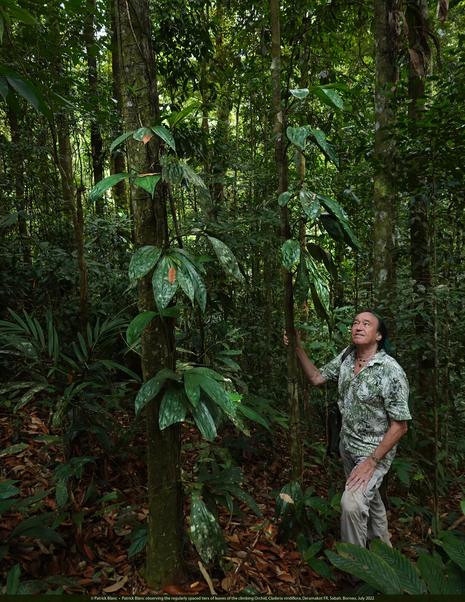 Patrick Blanc observing the regularly spaced tiers of leaves of the climbing Orchid, Claderia viridiflora, Deramakot FR, Sabah, Borneo, July 2022