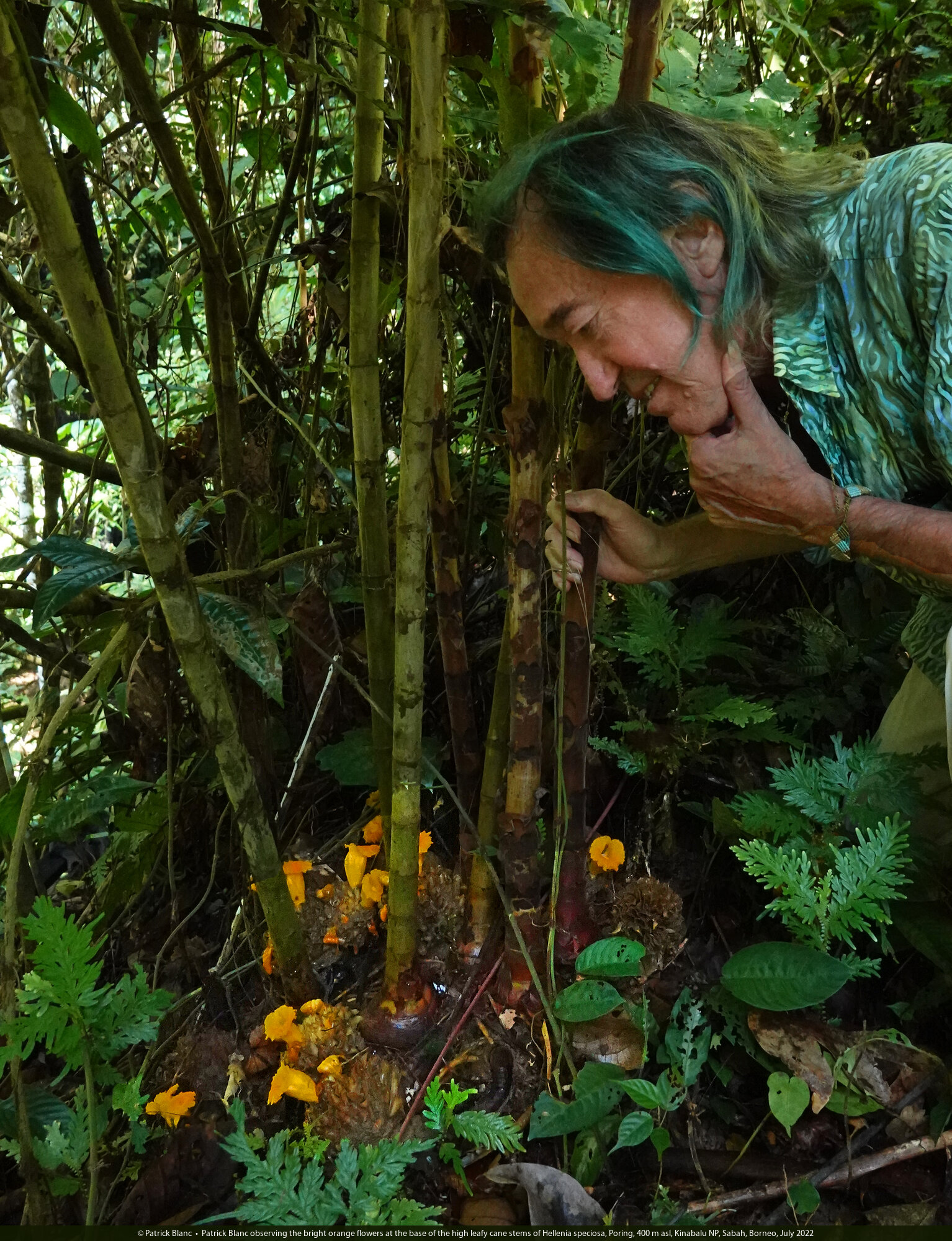 Patrick Blanc observing the bright orange flowers at the base of the high leafy cane stems of Hellenia speciosa, Poring, 400 m asl, Kinabalu NP, Sabah, Borneo, July 2022