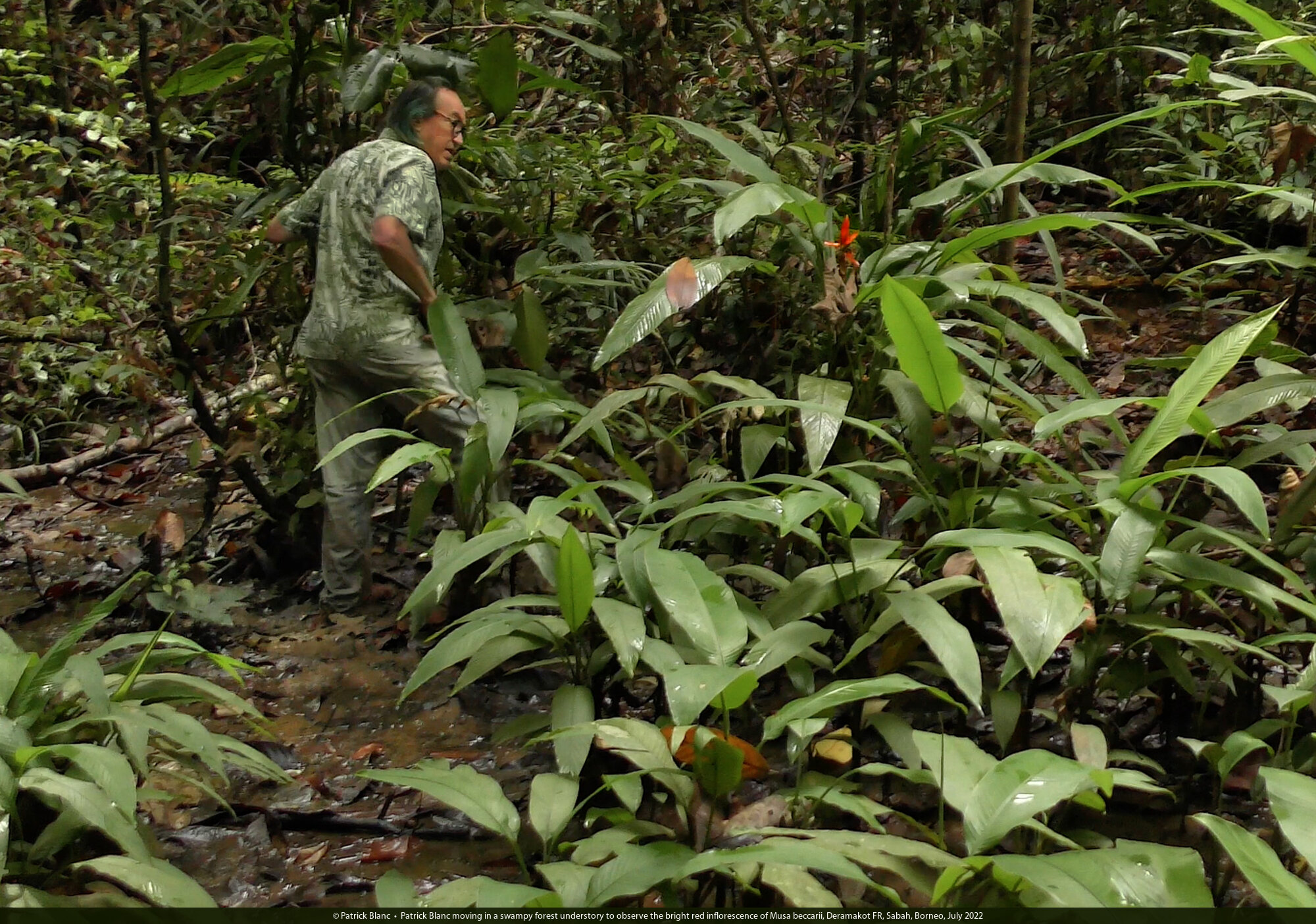 Patrick Blanc moving in a swampy forest understory to observe the bright red inflorescence of Musa beccarii, Deramakot FR, Sabah, Borneo, July 2022